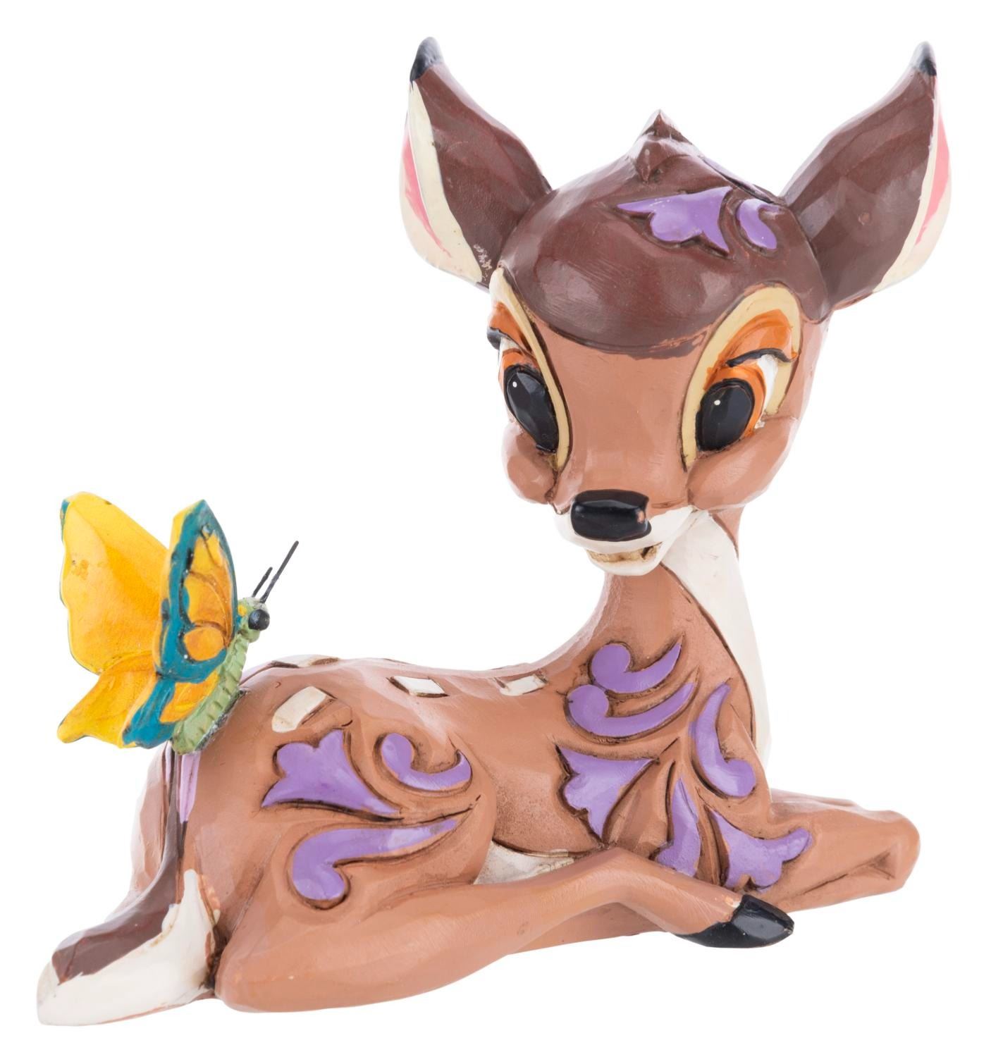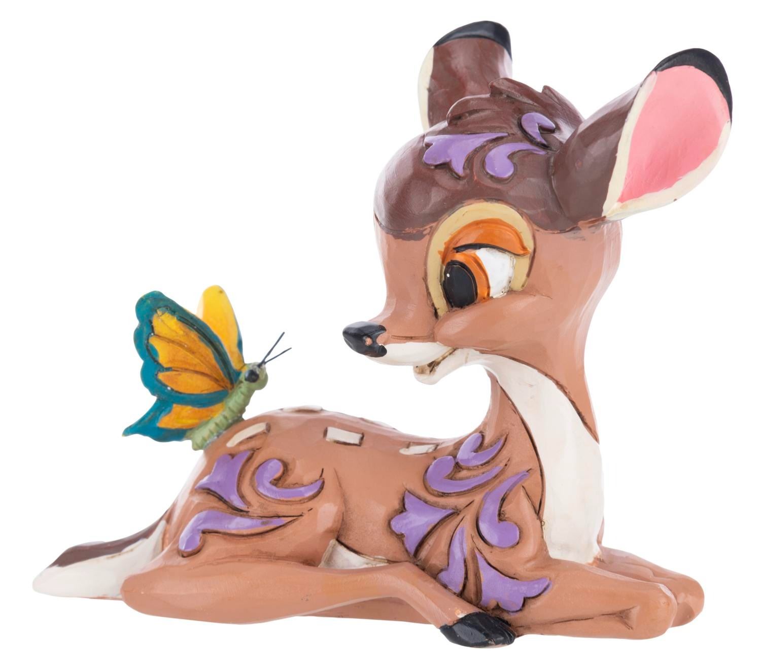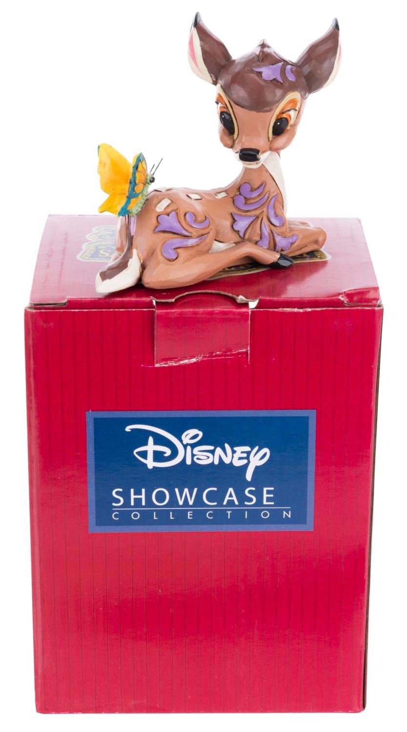 (Enesco, 2022) A Disney Showcase Collection Jim Shore mini figurine of Bambi and a butterfly. Measuring 3” x 1.75” x 3” tall with its original 3.75” x 3.75” x 5” tall box, the resin figurine is in fine condition, while the box displays in very good condition with light creases and wear.