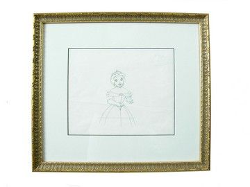 A truly unique collectable. This is an original production animation drawing of Snow White from the Disney Animation Studios in Burbank, California. It was specially created for an animation sequence at the Academy Awards, where an animated Snow White was a presenter! The drawing includes animator's notes. Drawing is slightly wrinkled. It is beautifully double matted, and encased in a gold painted frame. (Drawing is approx. 11"x9.5", gold frame is approx. 22.25" x 18.75" x 1".) Comes with a COA.