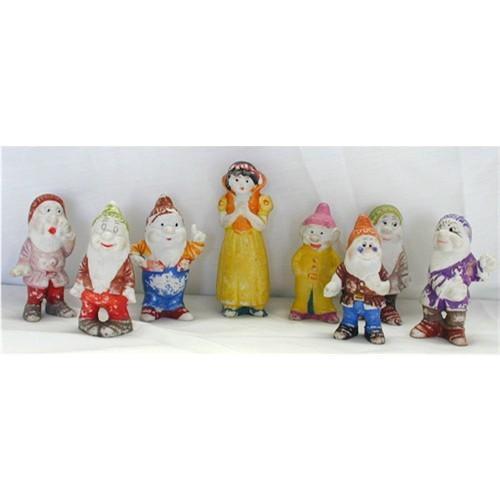 Snow White and the Seven Dwarfs are very old bisque figurines based on the 1937 film by Walt Disney Studios. Each figurine has their name on them and is marked Walt Disney on the back. There is wear to their colors, otherwise they are in good condition. Snow White is 3 1/4 inches tall and the dwarfs are 2 1/2 inches tall.