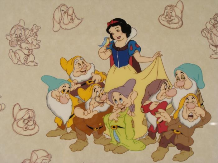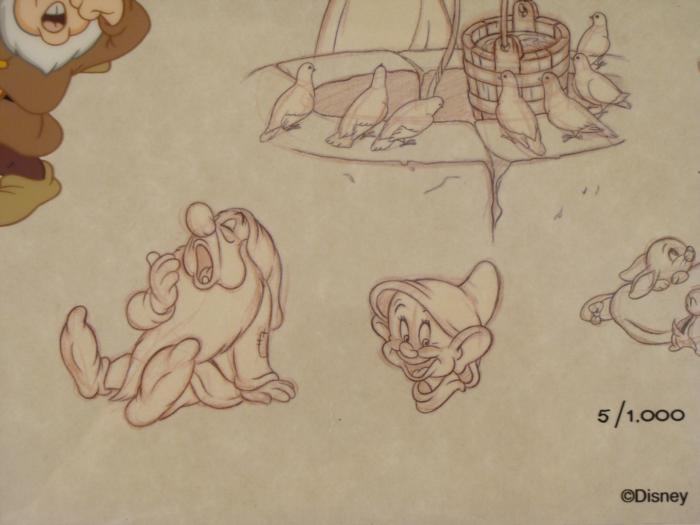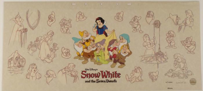 Walt Disney Snow White and the Seven Dwarfs Sericel w/ Background Art AnimationThis is a serigraph cel proof originally designed for a LumicelSize: 11 1/4" x 25"Title: Snow White and the Seven DwarfsCondition: ExcellentLimited Edition out of 1000The background features character sketches showing their different expressions.