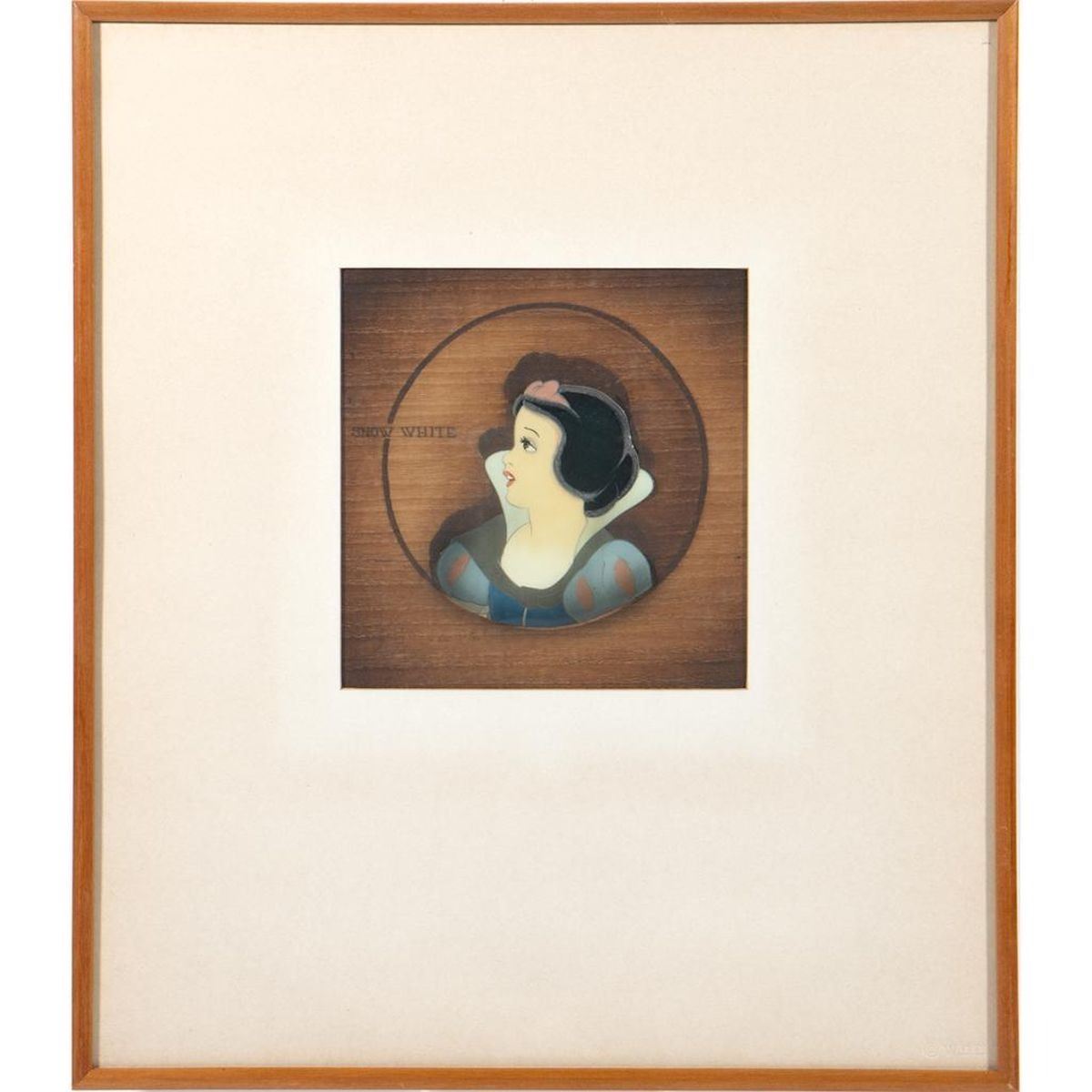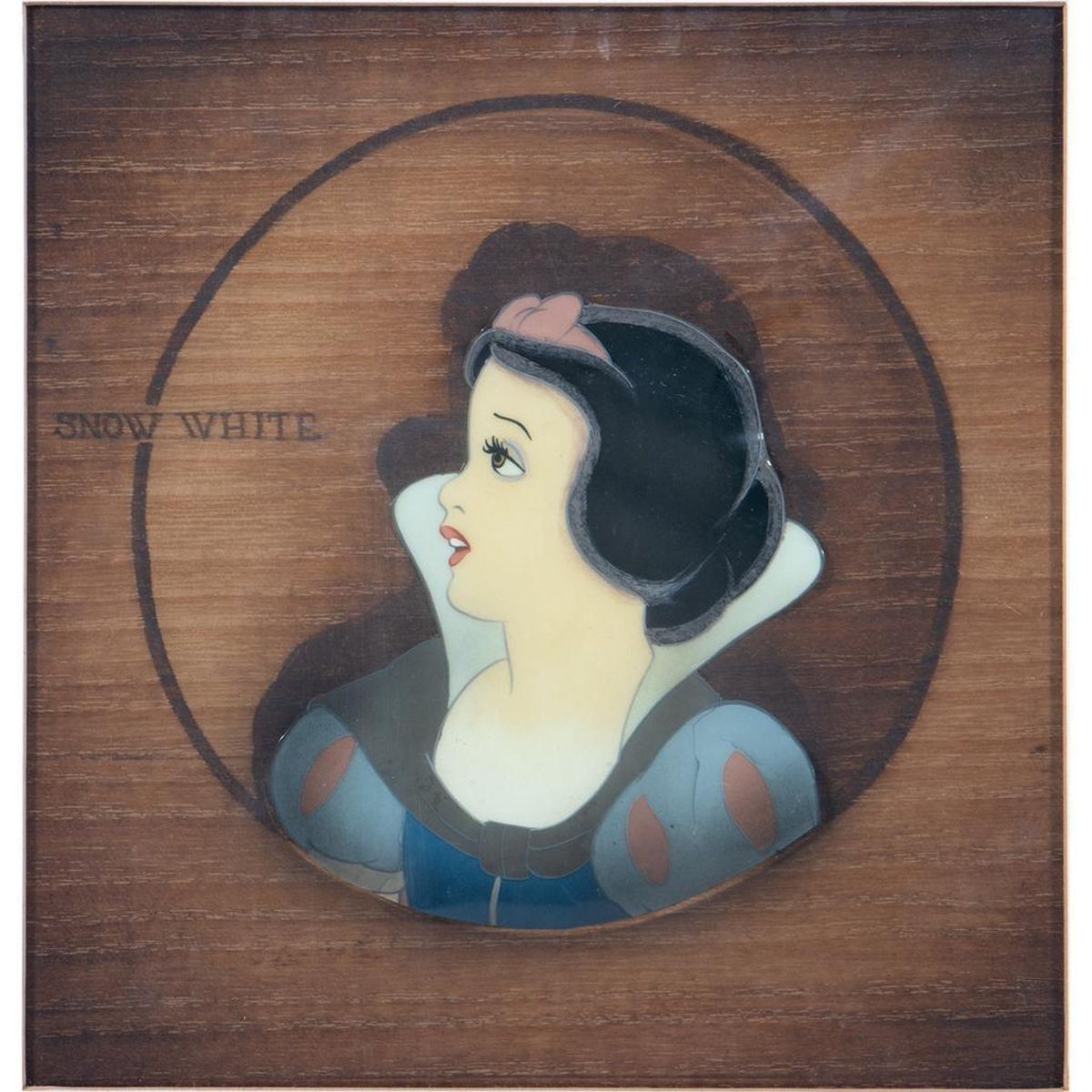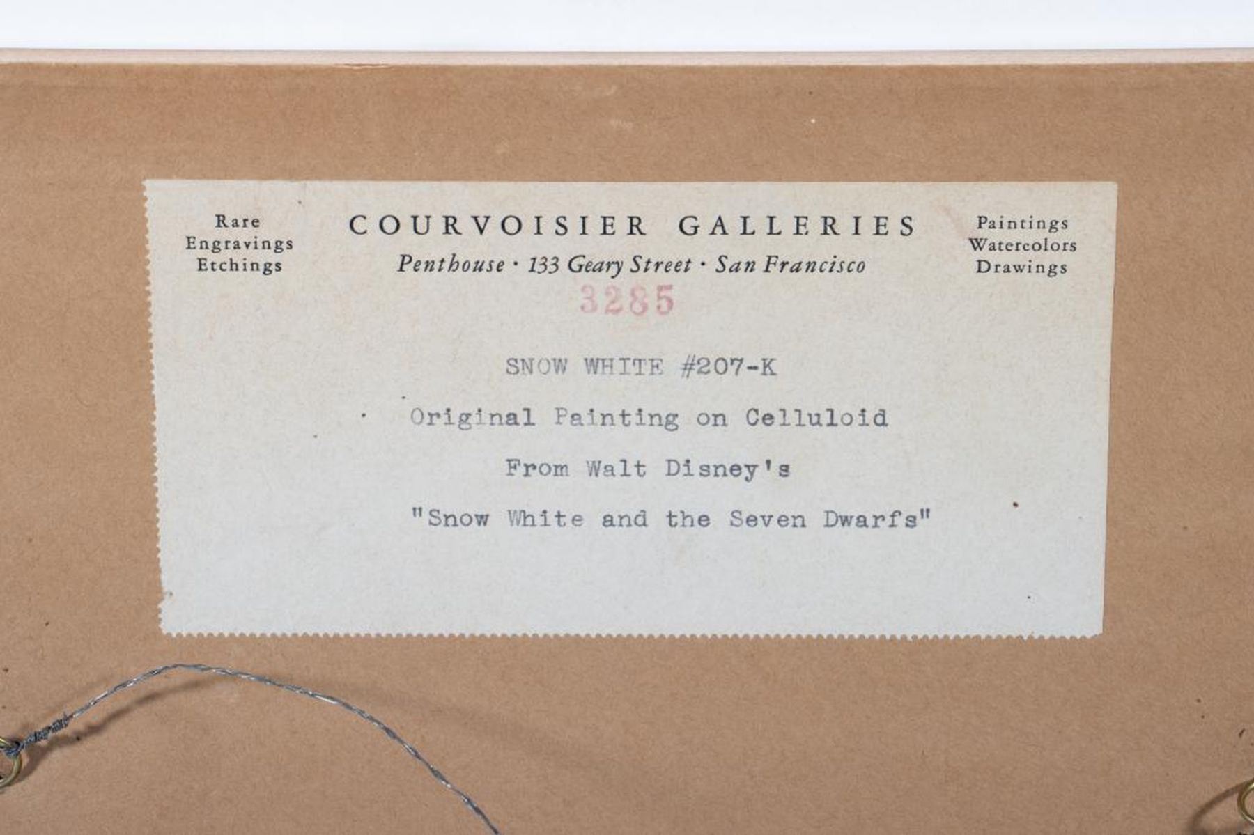 Original animation cel from the production of Disney's Snow White and the Seven Dwarfs, watercolor on celluloid, Title: "Snow White" #207-K. Tagged verso: Courvoisier Galleries label. Condition: Good. The cel has been trimmed and applied to a woodgrain background as prepared by Courvoisier Galleries. Size: 5.50" x 5.25" (sight), 14.50" x 12.50" (frame).