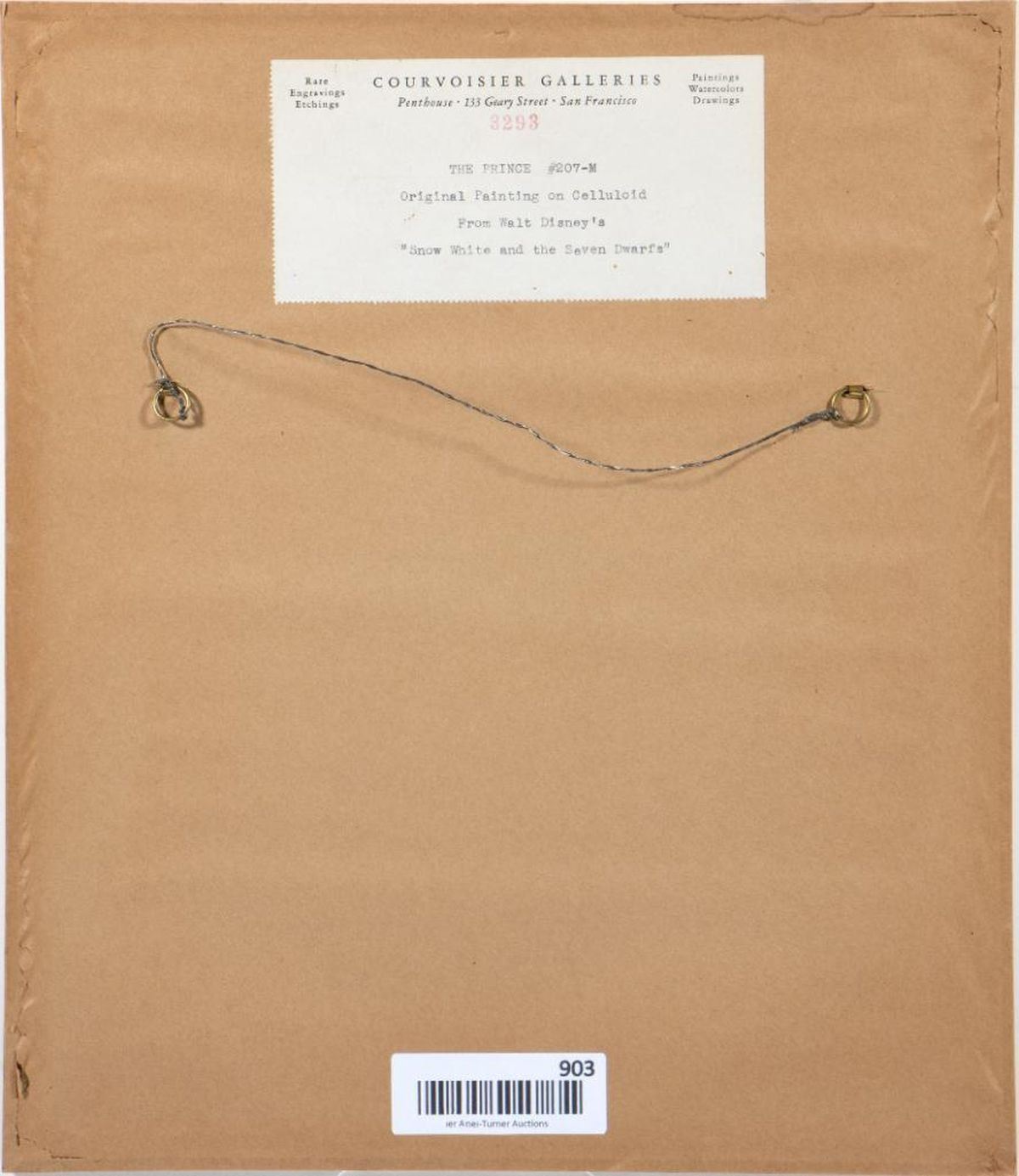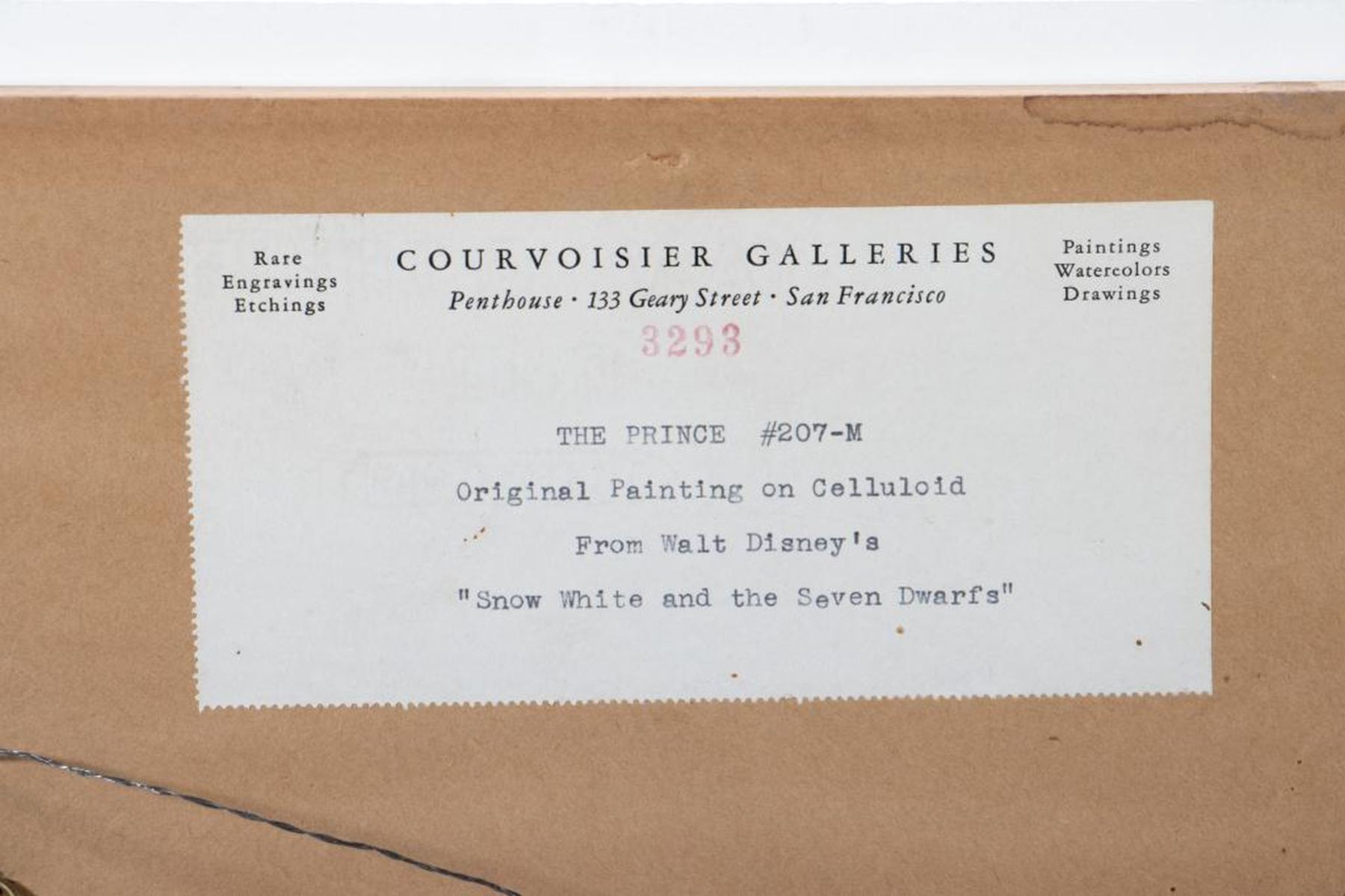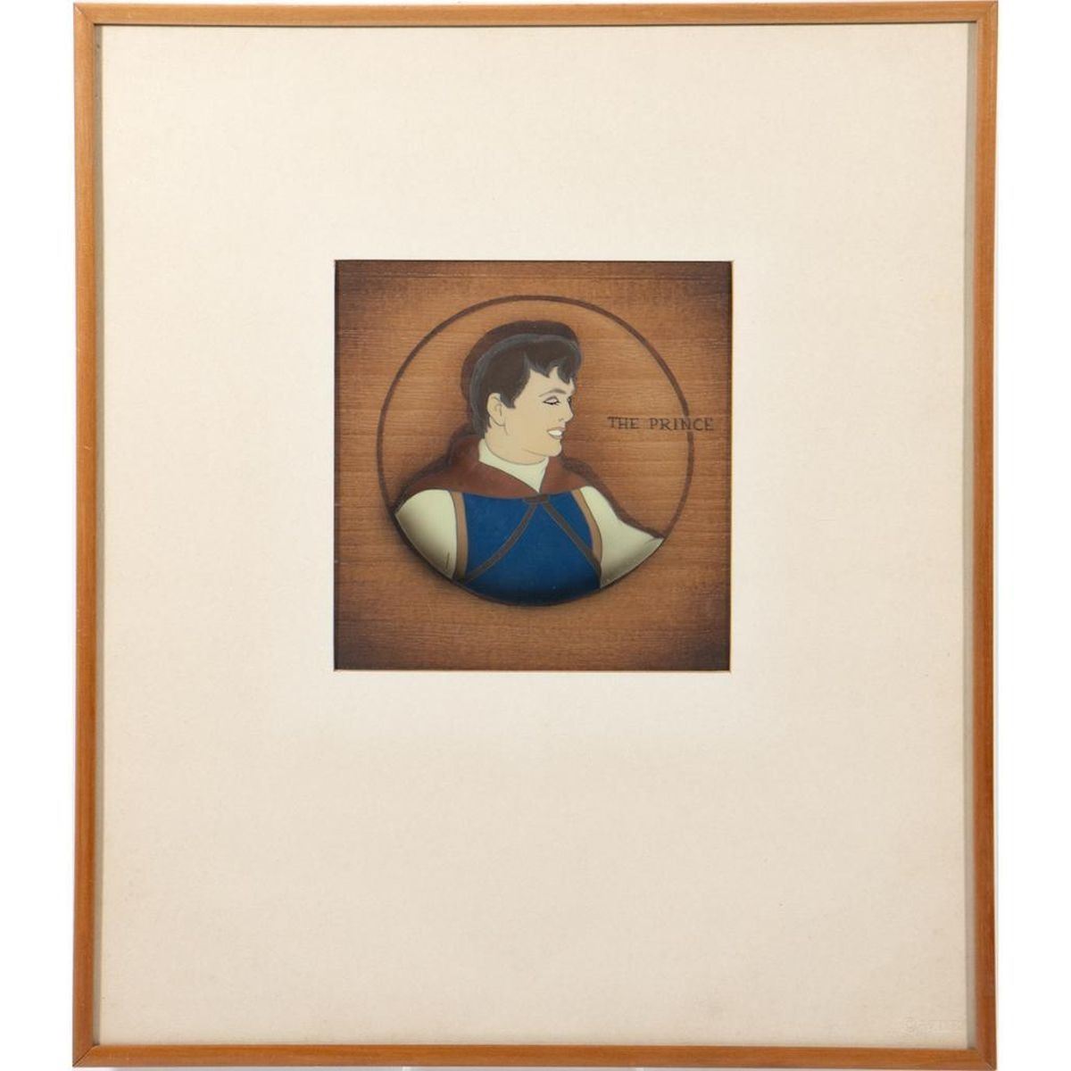 Original animation cel from the production of Disney's Snow White and the Seven Dwarfs, watercolor on celluloid, Title: "The Prince" #207-M. Tagged verso: Courvoisier Galleries label. Condition: Good. The cel has been trimmed and applied to a woodgrain background as prepared by Courvoisier Galleries. Size: 5.50" x 5.25" (sight), 14.50" x 12.50" (frame).