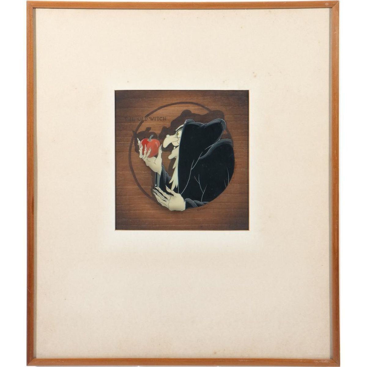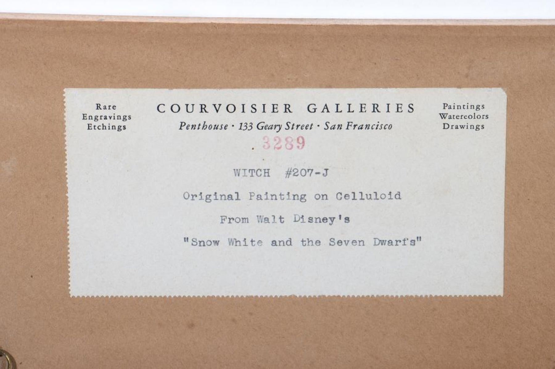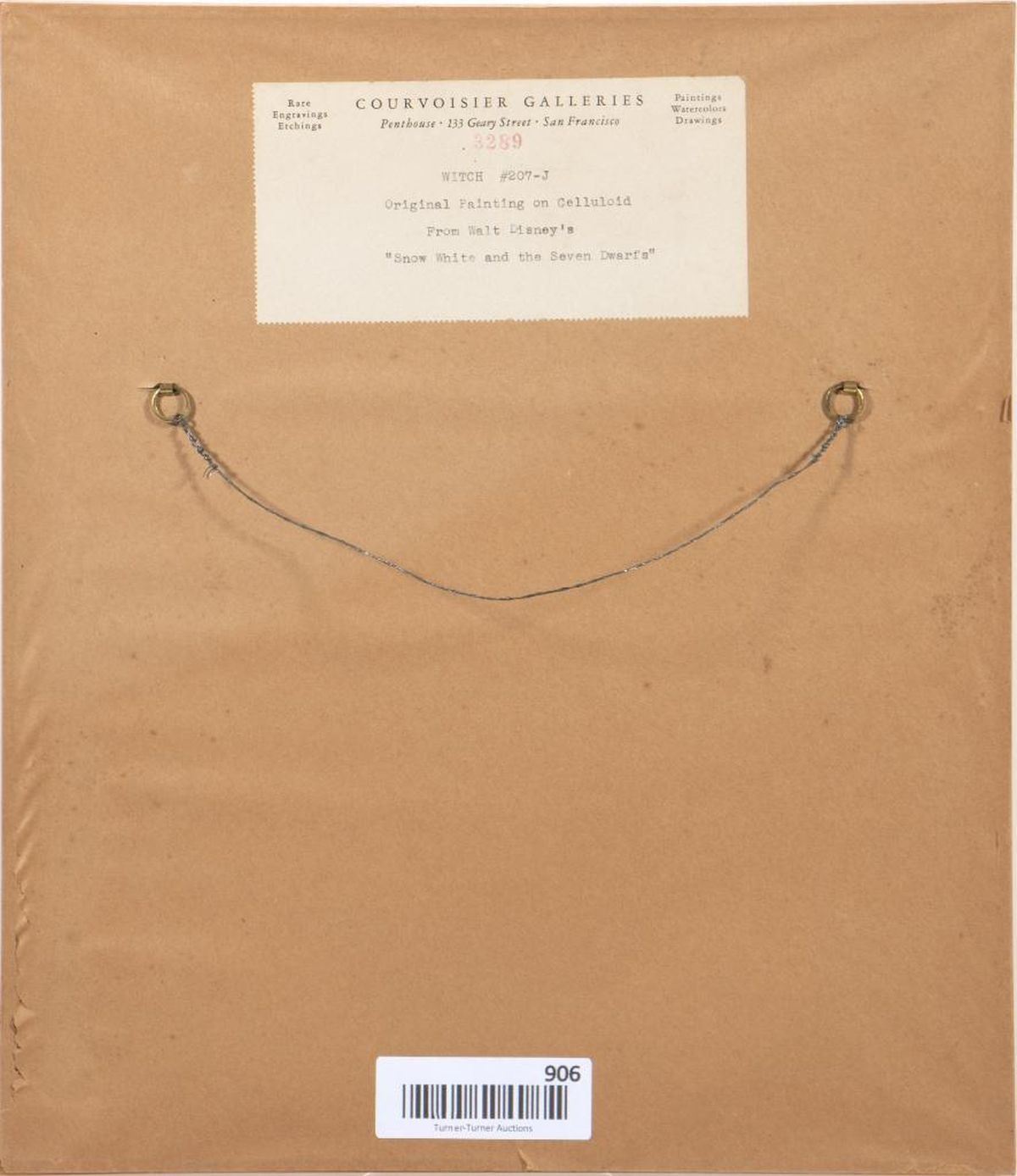 Original animation cel from the production of Disney's Snow White and the Seven Dwarfs, watercolor on celluloid, Title: "Witch" #207-J. Tagged verso: Courvoisier Galleries label. Condition: Good. The cel has been trimmed and applied to a woodgrain background as prepared by Courvoisier Galleries. Size: 5.50" x 5.25" (sight), 14.50" x 12.50" (frame).
