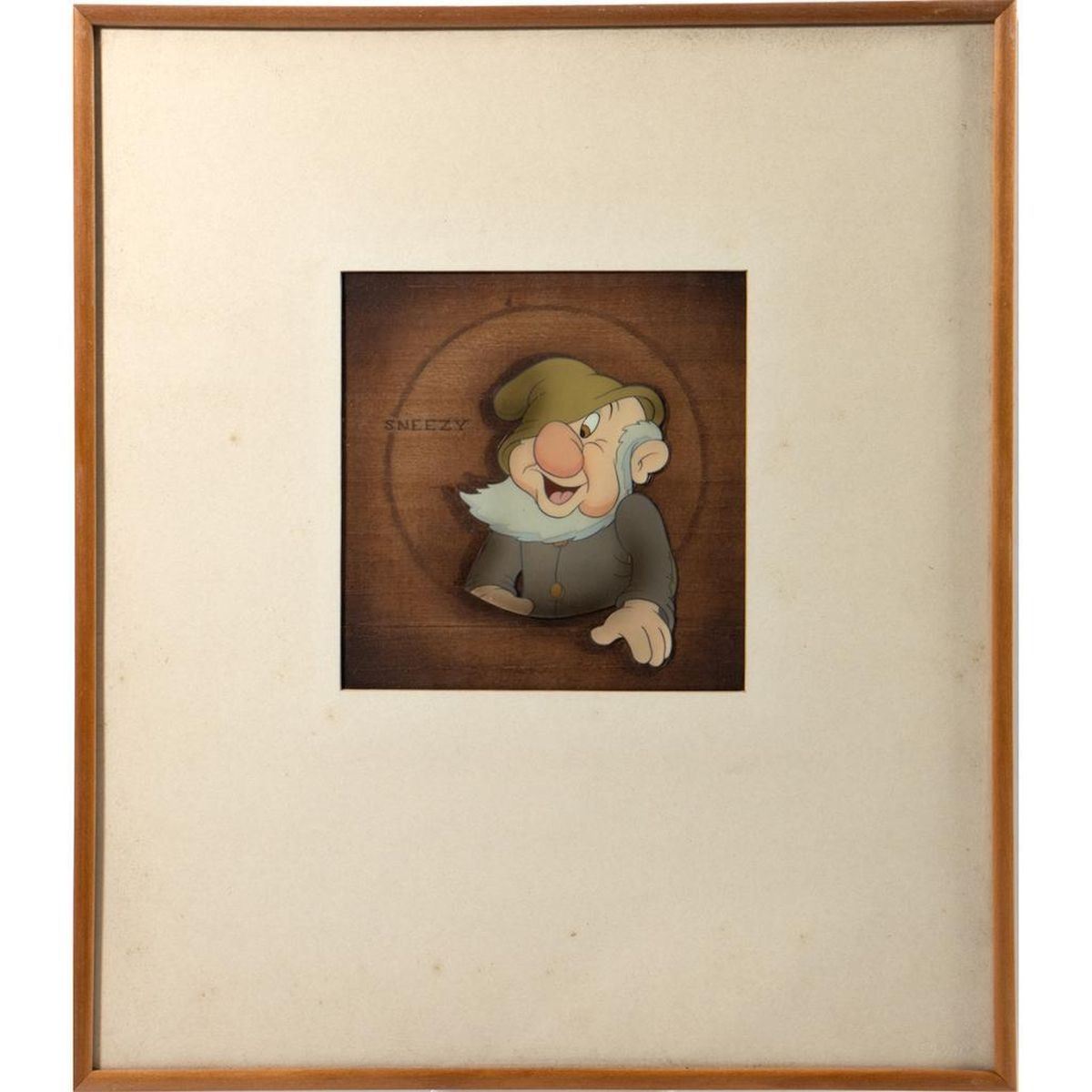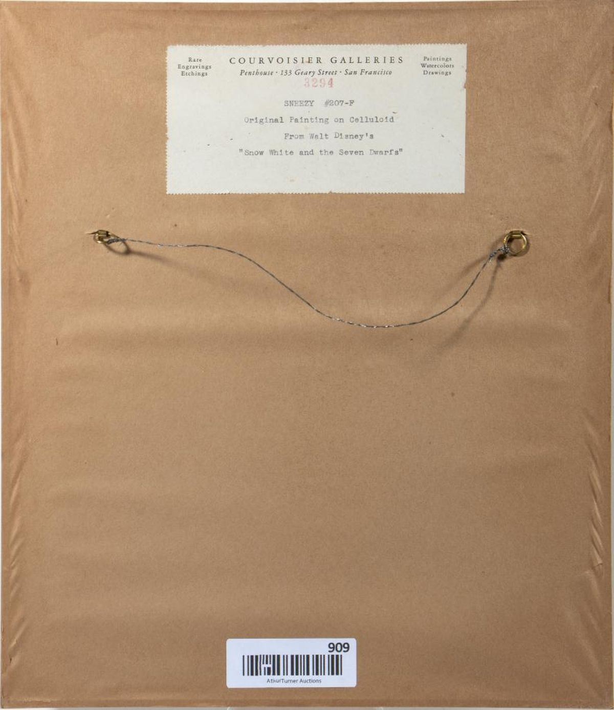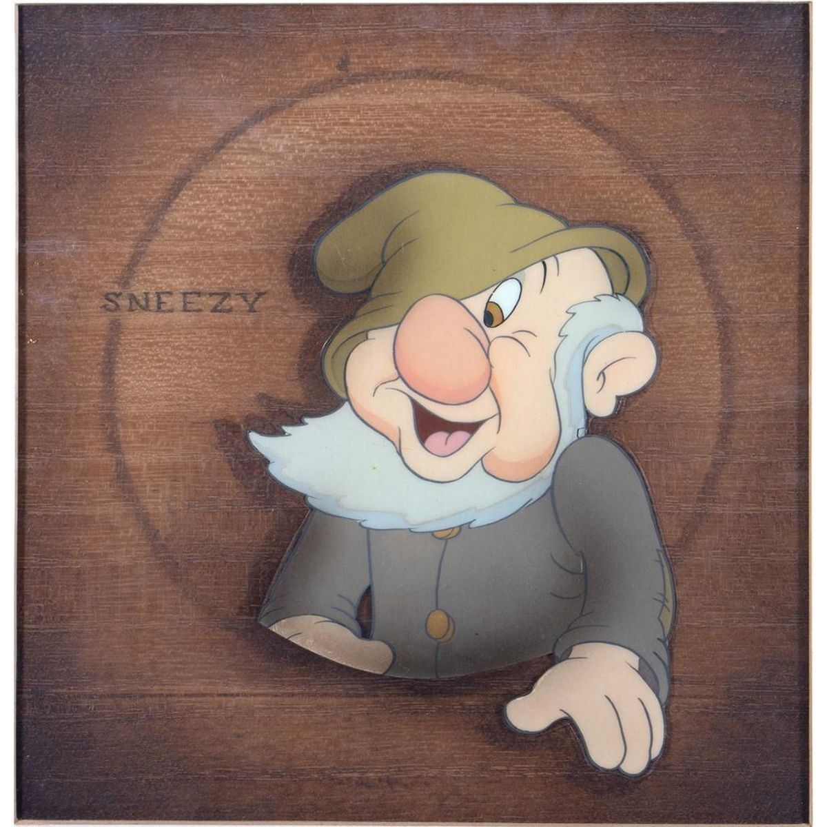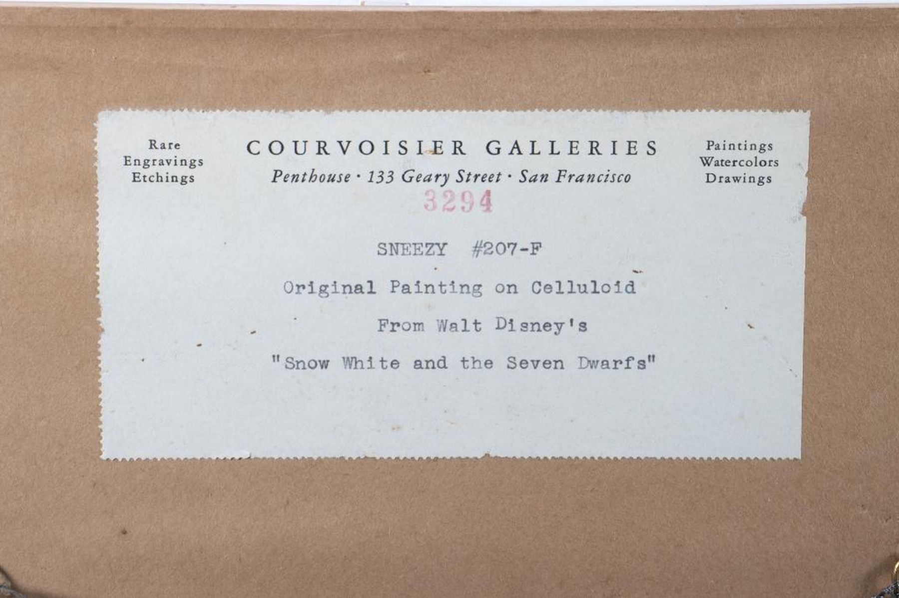 Original animation cel from the production of Disney's Snow White and the Seven Dwarfs, watercolor on celluloid, Title: "Sneezy" #207-F. Tagged verso: Courvoisier Galleries label. Condition: Good. The cel has been trimmed and applied to a woodgrain background as prepared by Courvoisier Galleries. Size: 5.50" x 5.25" (sight), 14.50" x 12.50" (frame).