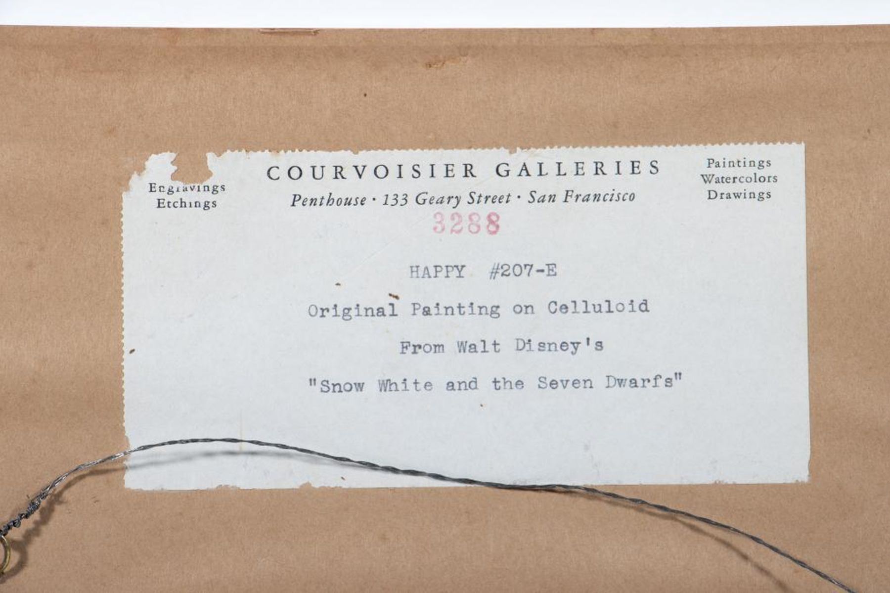 Original animation cel from the production of Disney's Snow White and the Seven Dwarfs, watercolor on celluloid, Title: "Happy" #207-E. Tagged verso: Courvoisier Galleries label. Condition: Good. The cel has been trimmed and applied to a woodgrain background as prepared by Courvoisier Galleries. Size: 5.50" x 5.25" (sight), 14.50" x 12.50" (frame).