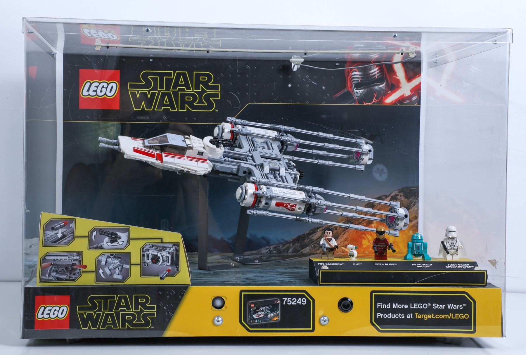 (Disney, c. 2019). A store used display for a LEGO Star Wars: The Rise of Skywalker Resistance Y-Wing Starfighter. The display includes an assembled starship in a display case with custom background, planet terrain and branding, including a display of character figures including Poe Dameron, D-O, Zorii Bliss, an Astromech Droid and a First Order Snowtrooper. The display is in good condition with normal wear from age and store use. Measures 23" x 15" x 15". Item comes with a Grand Circle Tour Auctions COA.