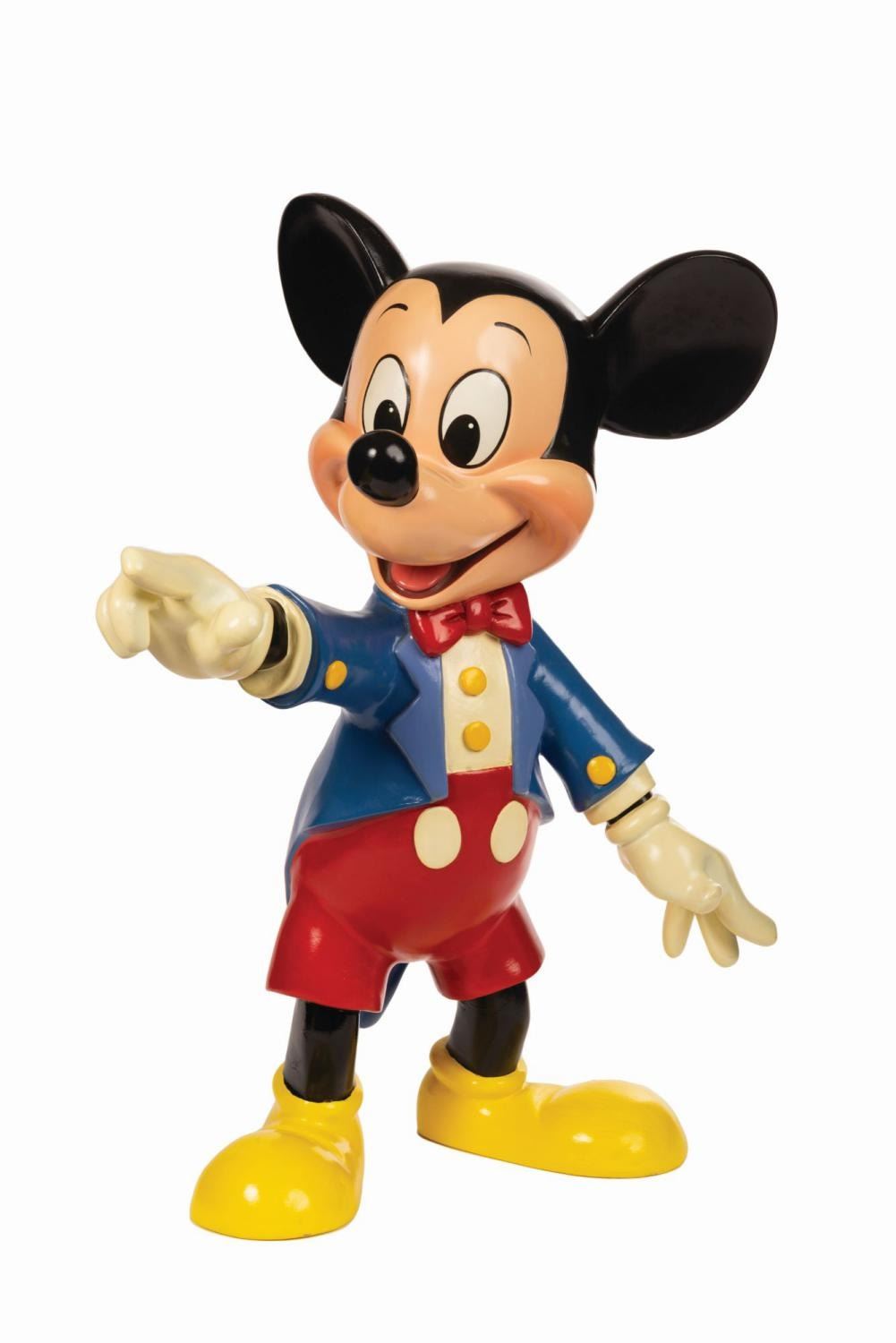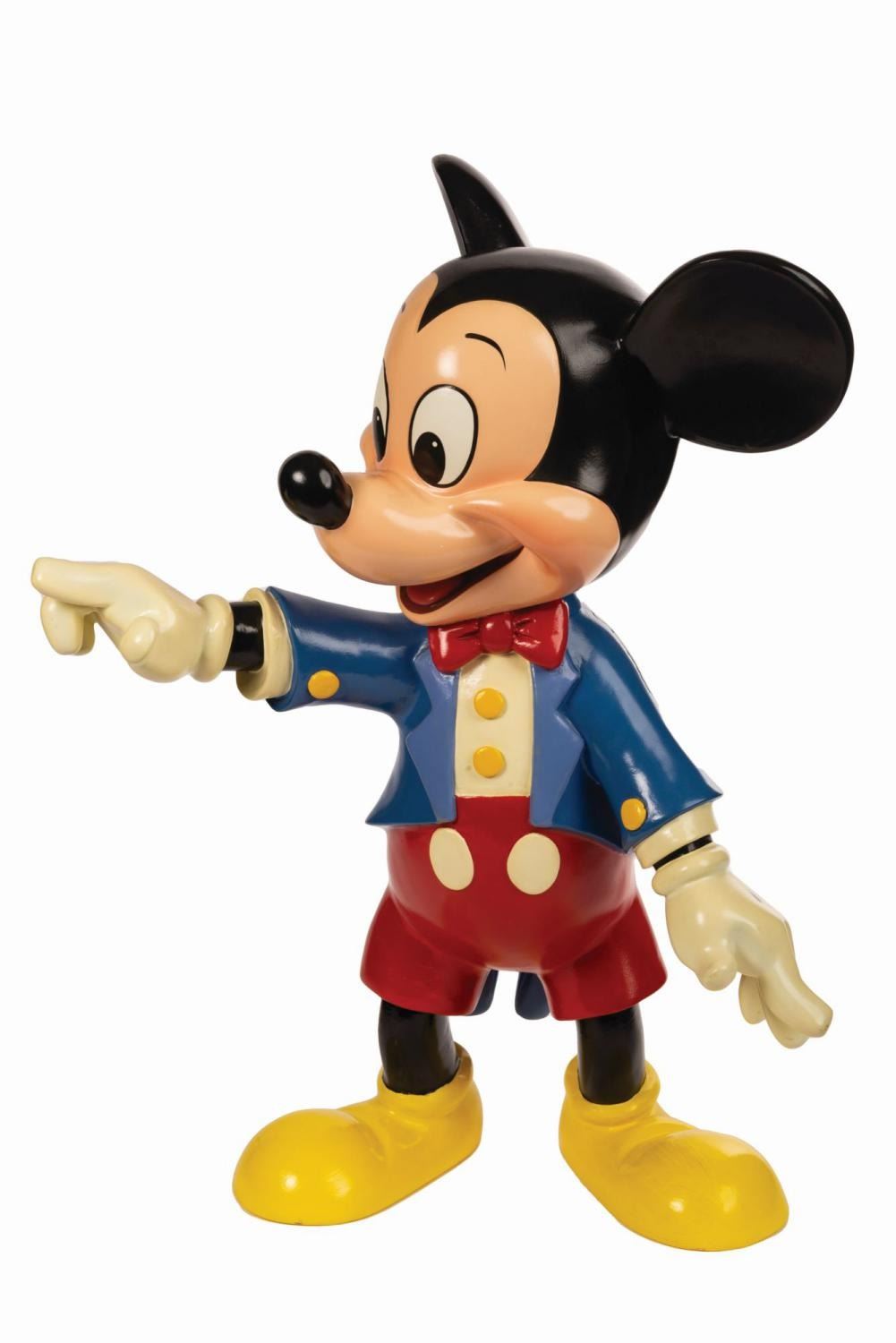 (Disney, c.1990s) A large painted fiberglass Disney Store display figure of Mickey Mouse. Mickey is depicted here in sleek attire, and measures approximately 26" tall. It is in good used condition with minor scuffs and scratches, as well as a thin crack at Mickey's right arm and neck that has some paint touch up.