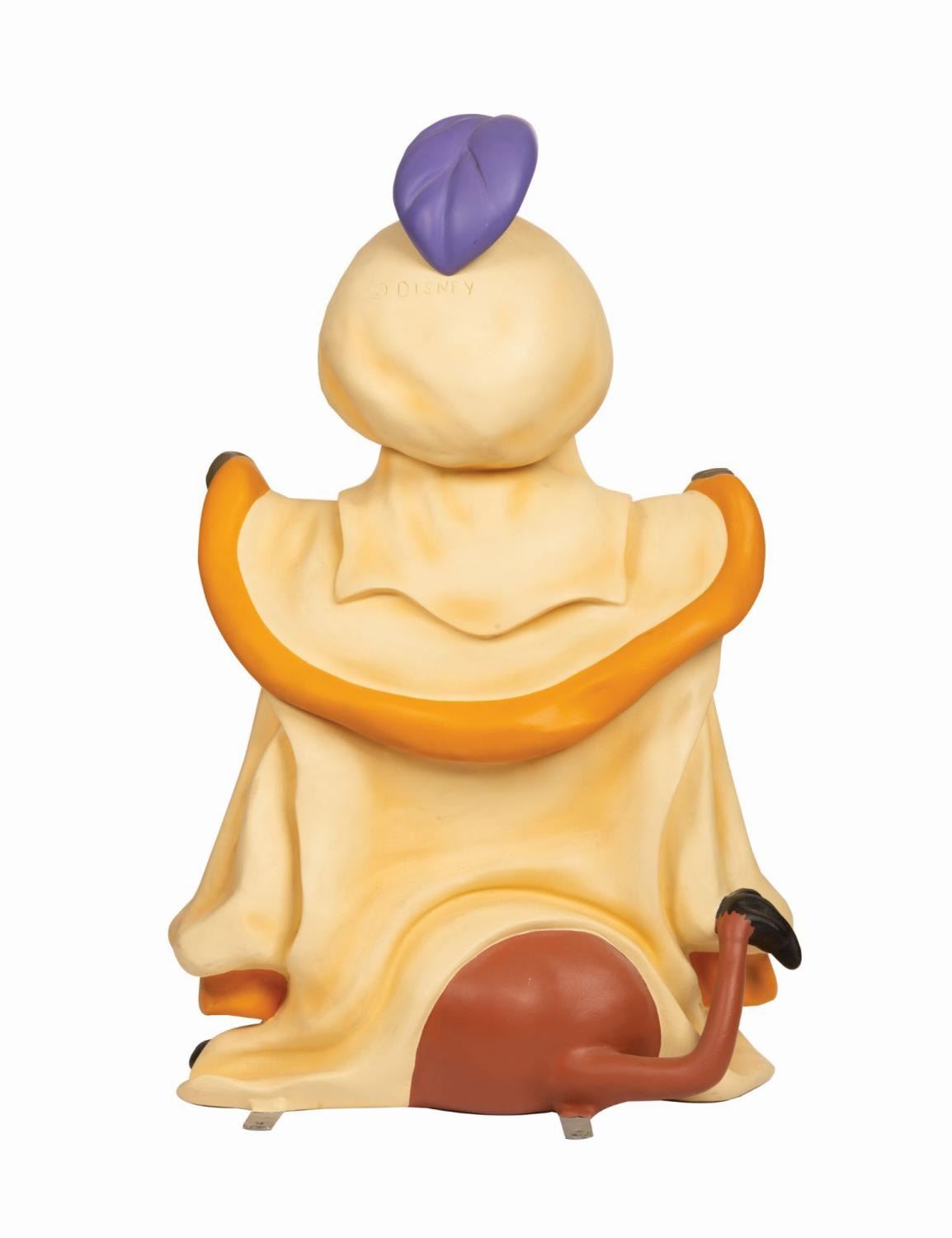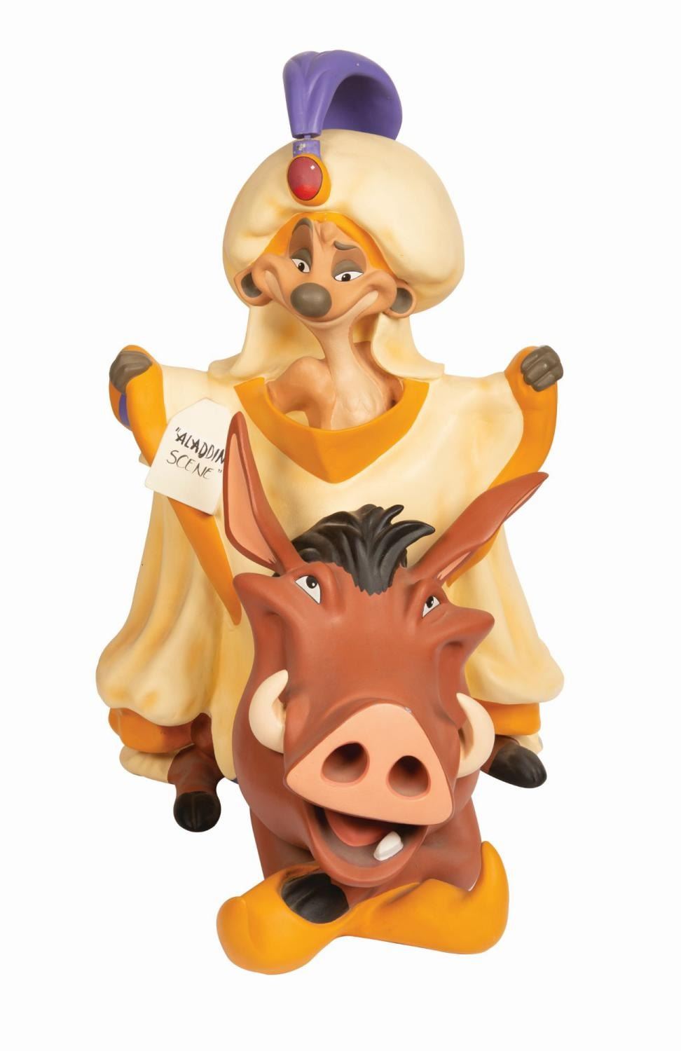 (Disney, c.1990s) A hand-painted large display figure of Timon and Pumba. The figure was displayed within the Disney Store near the time of the release of Lion King in 1994 and is composed of painted fiberglass. Timon and Pumba appear in "Prince Ali's" attire from Aladdin, having just gotten into a box of props from the "Aladdin scene." Measuring approximately 27"x23" and 35" tall, the figure is in good used condition. There is a crack where Timon's feather attaches to the hat so that it is somewhat loose but still secure in place. There are a few small chips and scuffs throughout from use. This item may require special shipping arrangements. Please inquire for details and estimates.