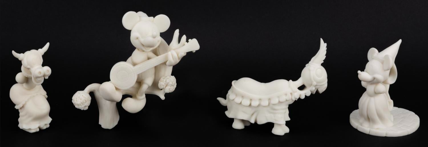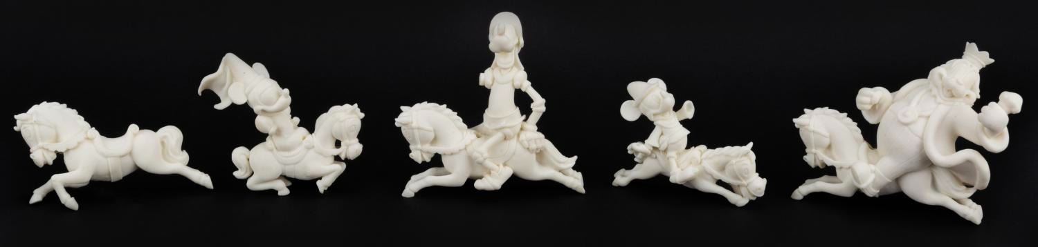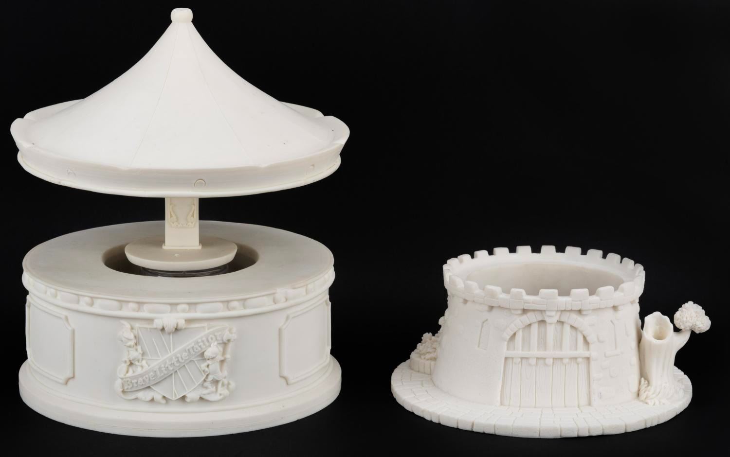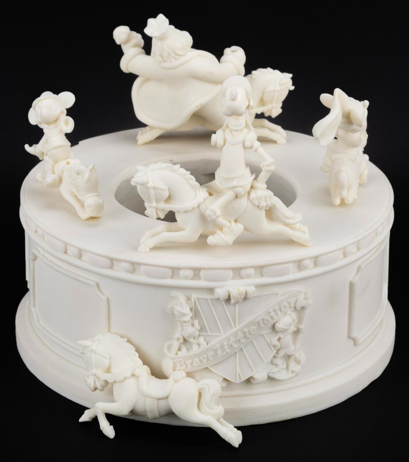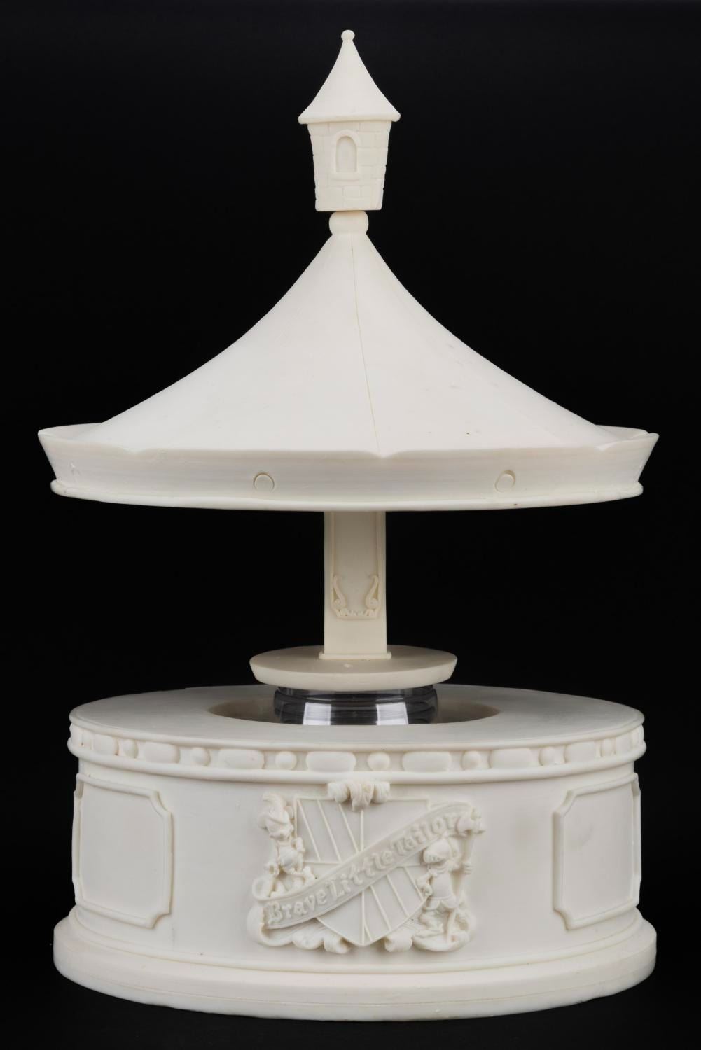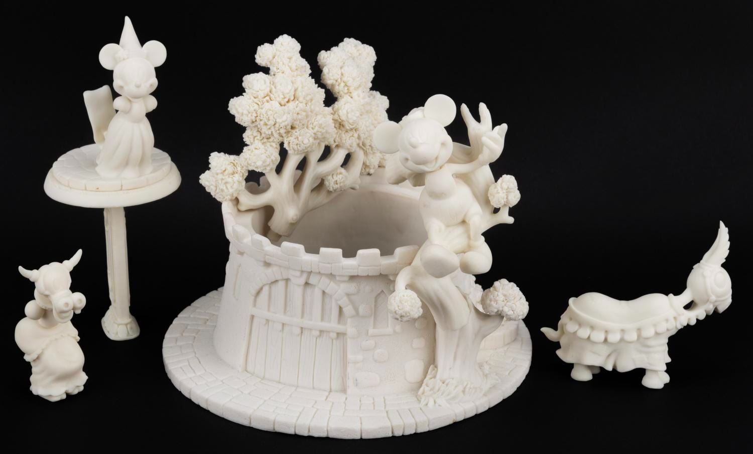 (Disney Store, 1990s) The whiteware production pieces created in designing two Disney Store Mickey Mouse snowglobes. Included are the pieces for a "Ye Olden Days" globe featuring a tower with Minnie and Clarabelle on top inside a globe, and Mickey outside on a tree branch playing a mandolin. The other set is from a “Brave Little Tailor” snowglobe featuring Mickey and Minnie riding a carousel inside. The pieces are in very good production-used condition.