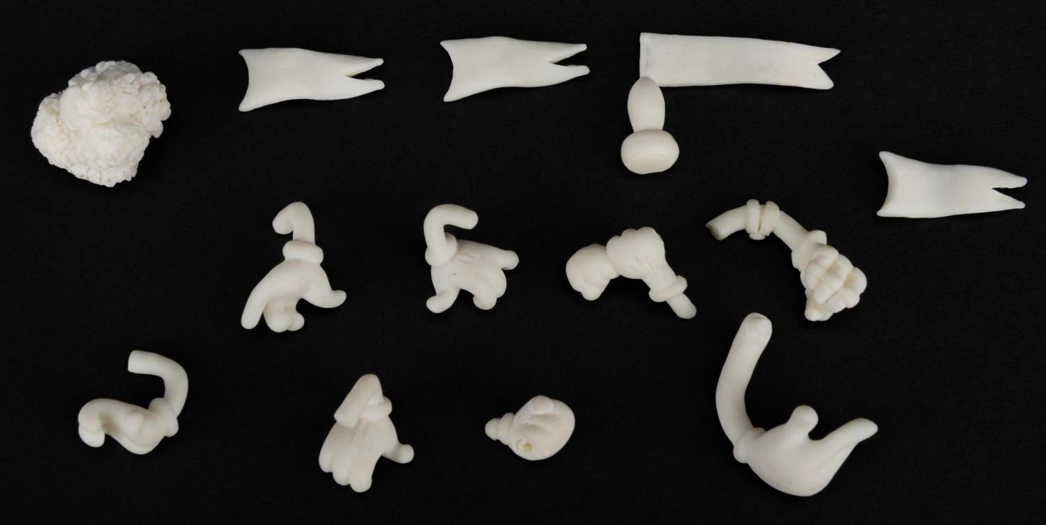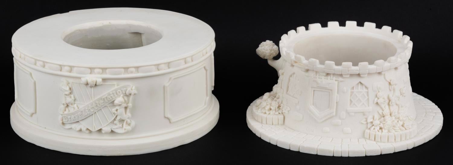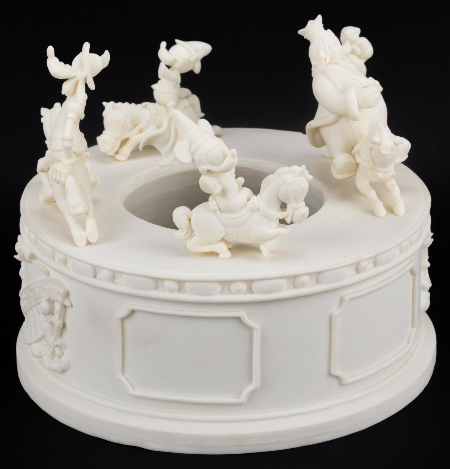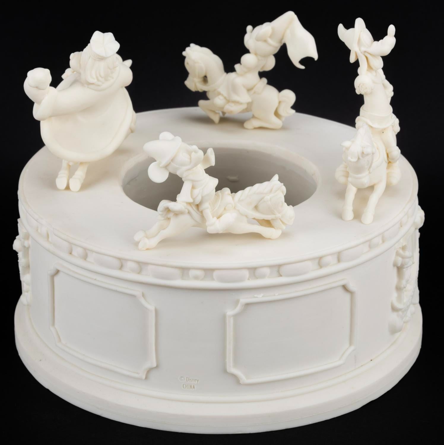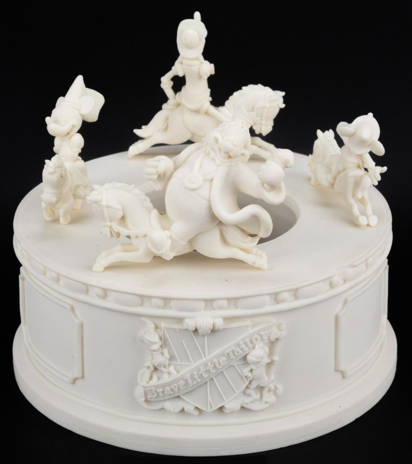 (Disney Store, 1990s) The whiteware production pieces created in designing two Disney Store Mickey Mouse snowglobes. Included are the pieces for a "Ye Olden Days" globe featuring a tower with Minnie and Clarabelle on top inside a globe, and Mickey outside on a tree branch playing a mandolin. The other set is from a “Brave Little Tailor” snowglobe featuring Mickey and Minnie riding a carousel inside. The pieces are in very good production-used condition.