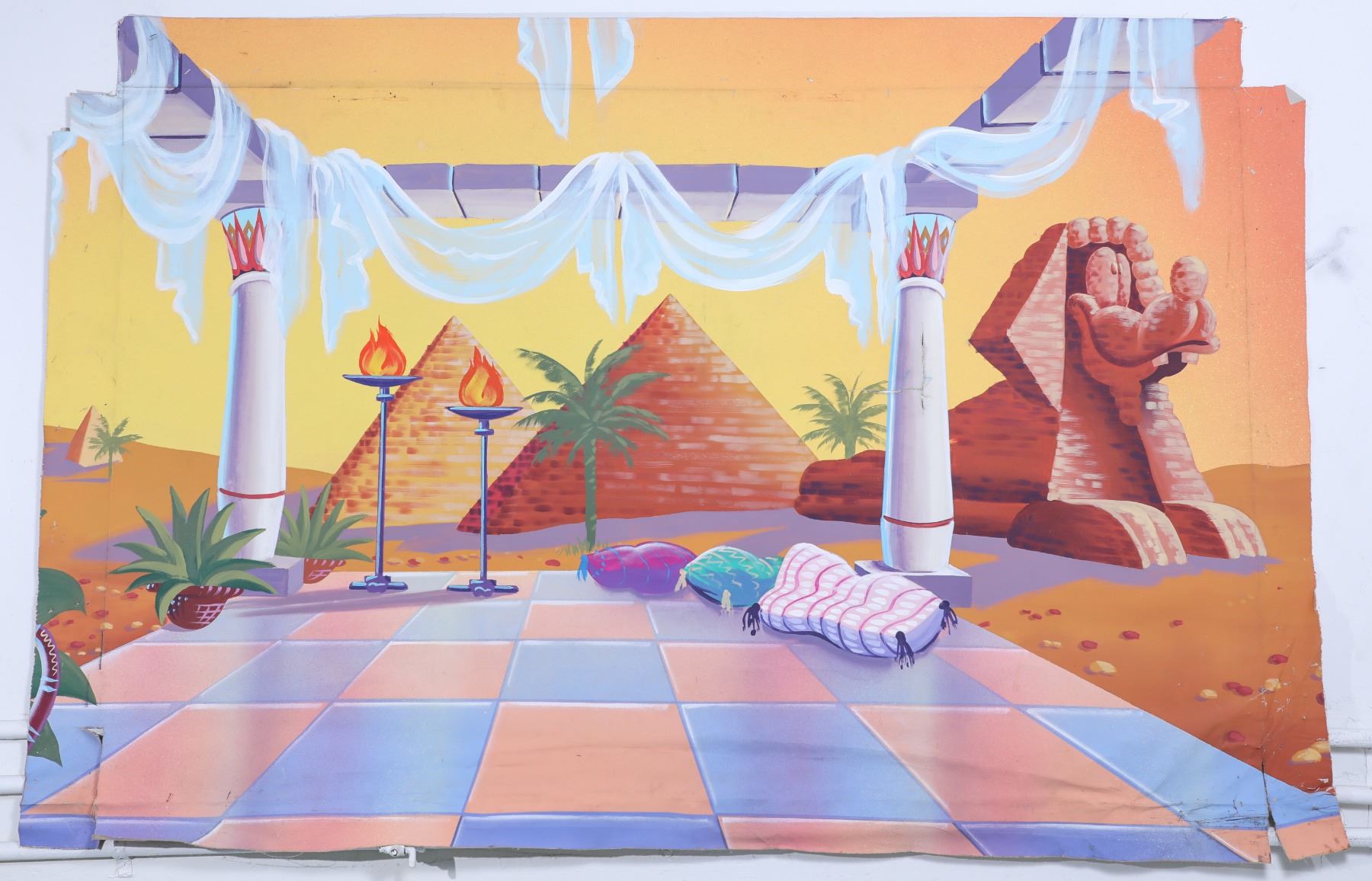 (Disney, c. 1989). A rare Disney Store used large canvas display, hand-painted for an Egypt setting and featuring a Goofy head pyramid. The canvas is in poor condition with normal wear from age and store use, including corners of the canvas that have parts missing, tears into the canvas and wrinkling of the canvas. Stamped copyright 1989 Walt Disney Co. on the backside. The canvas can be stretched onto a wooden frame, as that's how they were displayed back in the late 80's. Measures approximately 77" x 52". Item comes with a Grand Circle Tour Auctions COA.