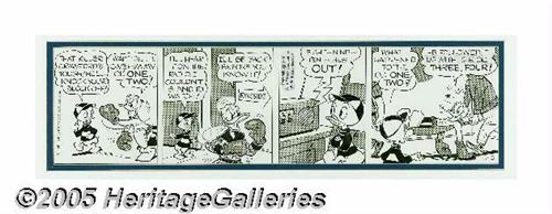 <B>Disney Studio Artist - Donald Duck Daily Comic Strip Original Art, dated 11-13-74 (King Features Syndicate, 1974).</B></I> When it comes to boxing, Donald Duck is a <I>real</B></I> featherweight! Here's a delightful (and painful) <I>Donald Duck</B></I> daily comic strip created by Disney artists in 1974. Aside from some discoloration of the Zipatone, which does little to detract from the wonderful eye-appeal of this sports-themed piece, the art is in Excellent condition. With an image area of approximately 18" x 5", this strip is a knockout!