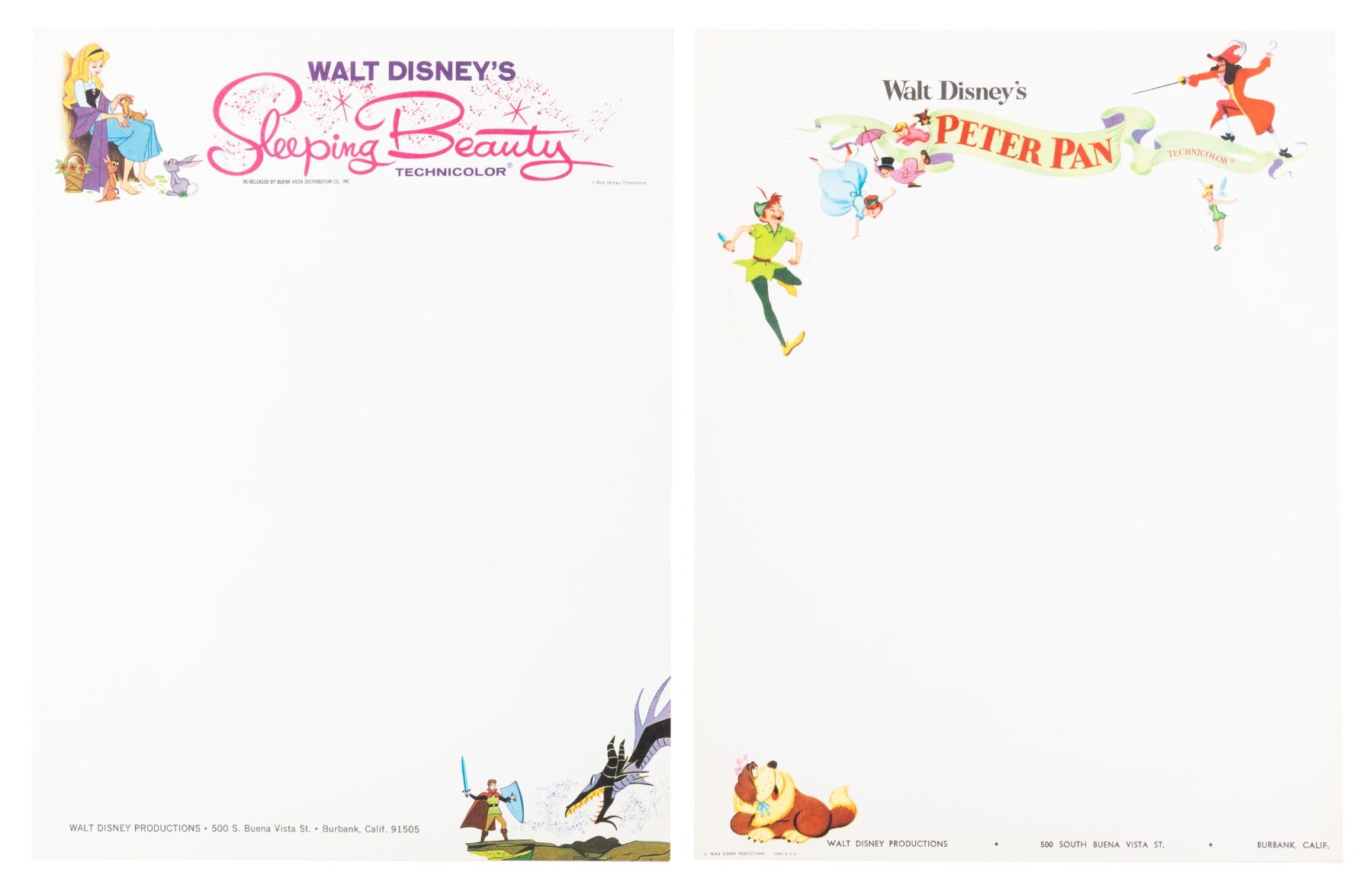 (Disney, 1950s) Two beautiful sheets of Disney Studio letterhead for “Peter Pan” and “Sleeping Beauty.” These were created and used only for correspondence during the production of these two classic animated films. Each measuring 8.5” x 11”, the stationery is in very good to fine condition with the slightest wear from age and handling. Est. Opening Bid: $20.00