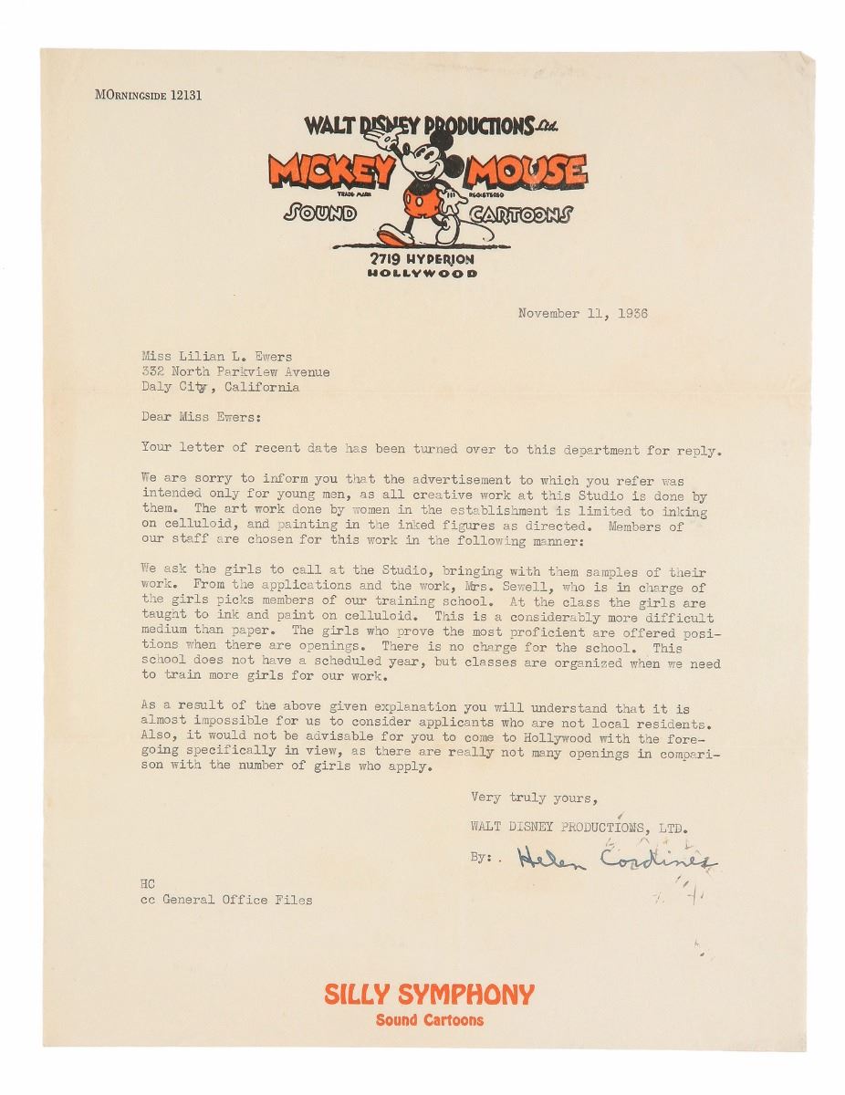 (Walt Disney Productions, 1936) A rare and historically significant rejection letter on studio stationery sent to Lillian Ewers, a female artist who was interested in working on Disney animated cartoons. Ewers was told that the job advertisement she had read was "intended only for young men, as all creative work at this Studio is done by them." An interesting document that shows a look into the early life of Walt Disney Productions. A photo of the Ink and Paint Department circa 1936 is included in this lot, and the letter notes that, "the artwork done by women in the establishment is limited to inking on celluloid, and painting in the inked figures as directed." Letter measures 11"x8.5" and photo measures 8"x10". Letter is in good condition with some fold marks and minimal wear. Photo is in very good condition with minimal wear.