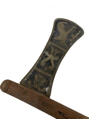 Disney Studios Archives wooden axe with heiroglyphics on the blade. Axe handle is wood with painted black cirlces and the blade is metal, painted with the symbols. (27"x9").This incredible memorabilia comes direct from the Debbie Reynold's archive collection. Debbie Reynolds and Todd Fisher purchased and acquired this amazing collection decades ago from the MGM auction, 20th Century Props auctions, Christie's auctions, Planet Hollywood and numerous additional auctions. Debbie Reynolds then opened Hollywood Central Props where many of these props and costumes were used in the making of feature films and television shows. This auction also marks the beginning of a long-term collaboration with The Debbie Reynolds’ Archives and her son Todd Fisher with a collection of props, costumes and photos including an ensemble from CHOCOLAT, ROMEO AND JULIET, MISSISSIPPI, V FOR VENDETTA, THE PATRIOT, THE LAST SAMURAI and more!