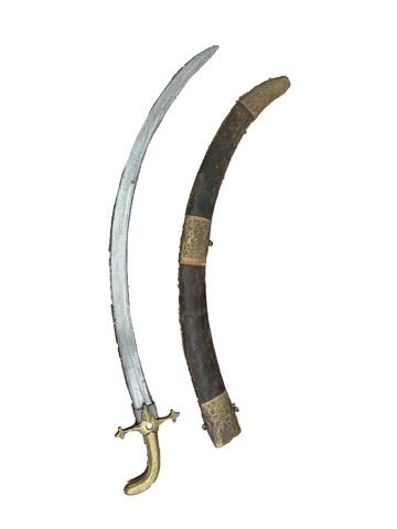 Walt Disney Studios Prop Department curved sword made of resin with a brass colored metal handle and a distressed leather with metal detail scabbard (approx 37" long). Only one of this kind available. This amazing memorabilia comes direct from the Debbie Reynold's archive collection.