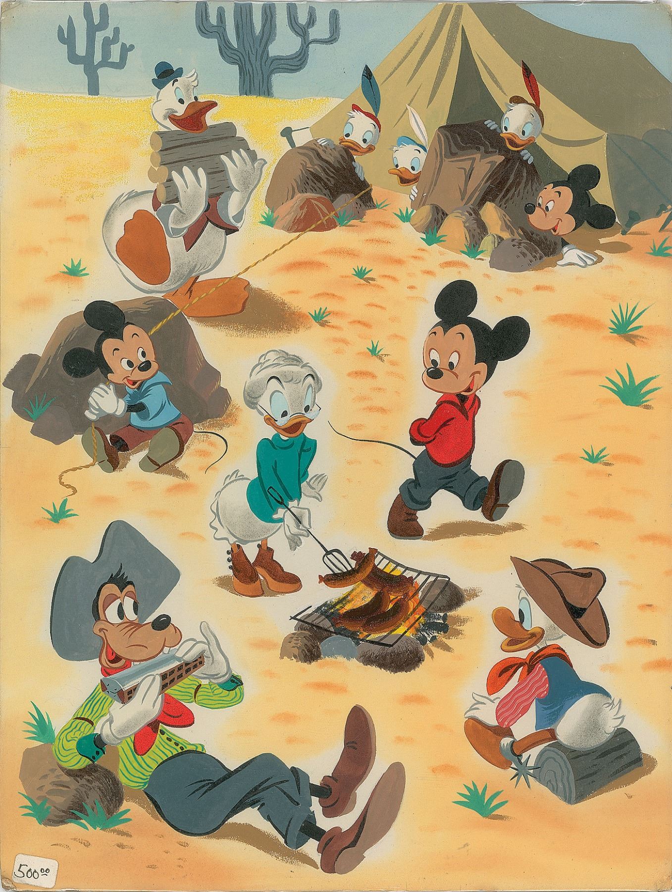 (Walt Disney Studios/Whitman Publishing, 1960s) Original hand-painted artwork done for Whitman Publishing in the early 1960s, showing Mickey, Goofy, Donald Duck, and others in a desert scene. Accomplished in gouache on an 11.75 x 15.25 illustration board. In fine condition.