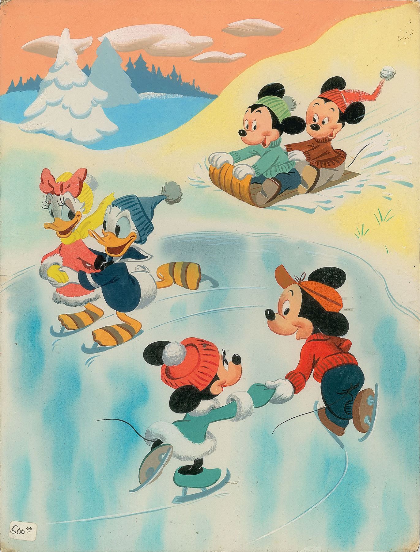 (Walt Disney Studios/Whitman Publishing, 1960s) Original hand-painted artwork done for Whitman Publishing in the early 1960s, showing Mickey Mouse, Minnie Mouse, Donald Duck, Daisy, and Mickey's nephews in a winter scene. Accomplished in gouache on an 11.75 x 15.25 illustration board. In fine condition.