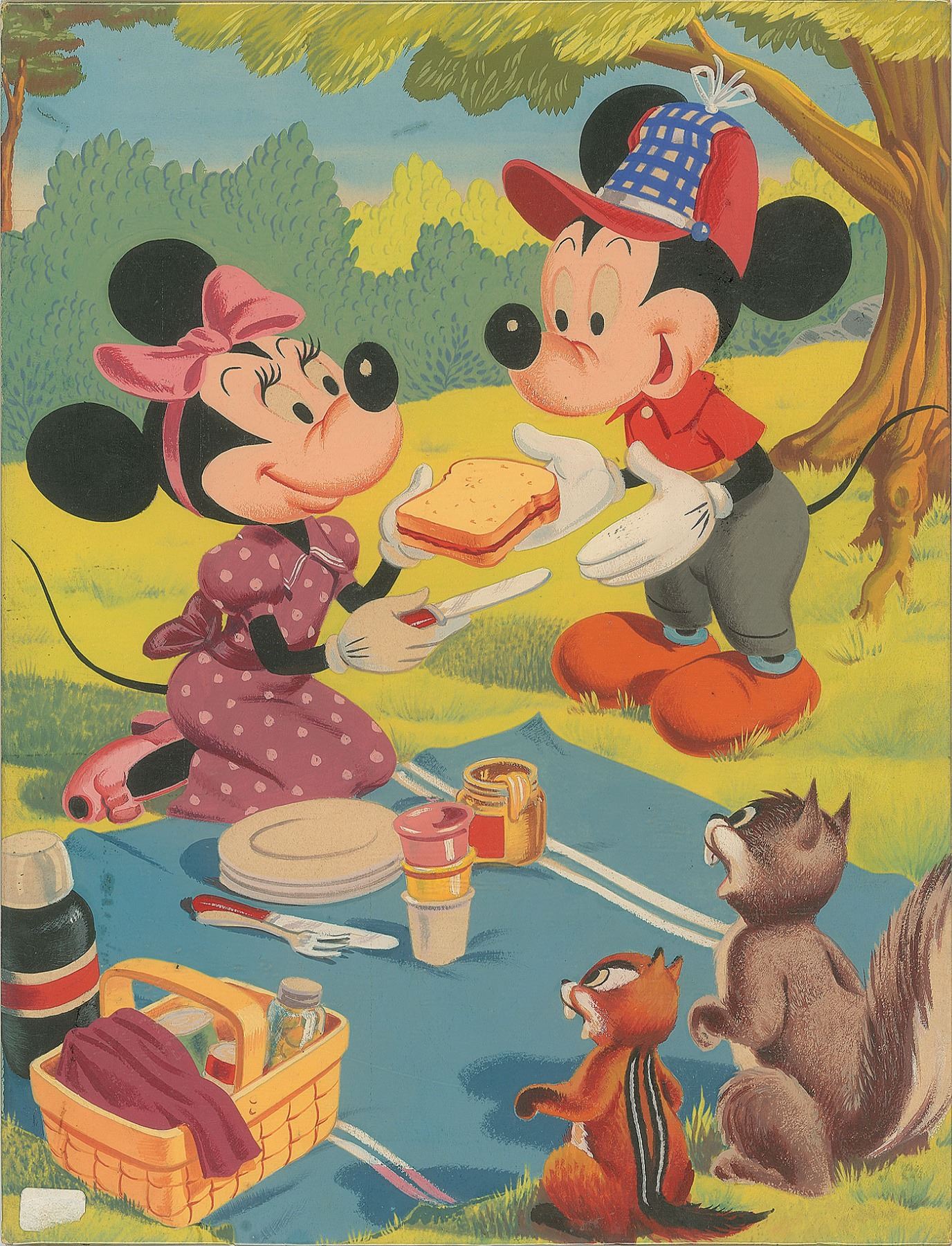 (Walt Disney Studios/Whitman Publishing, 1950s) Original hand-painted artwork done for Whitman Publishing in the late 1950s, showing Mickey Mouse and Minnie Mouse having a picnic. Accomplished in gouache on an 11 x 14.5 illustration board. In fine condition.