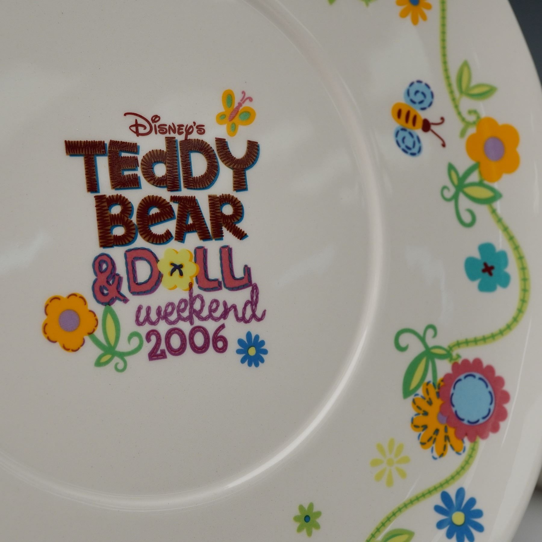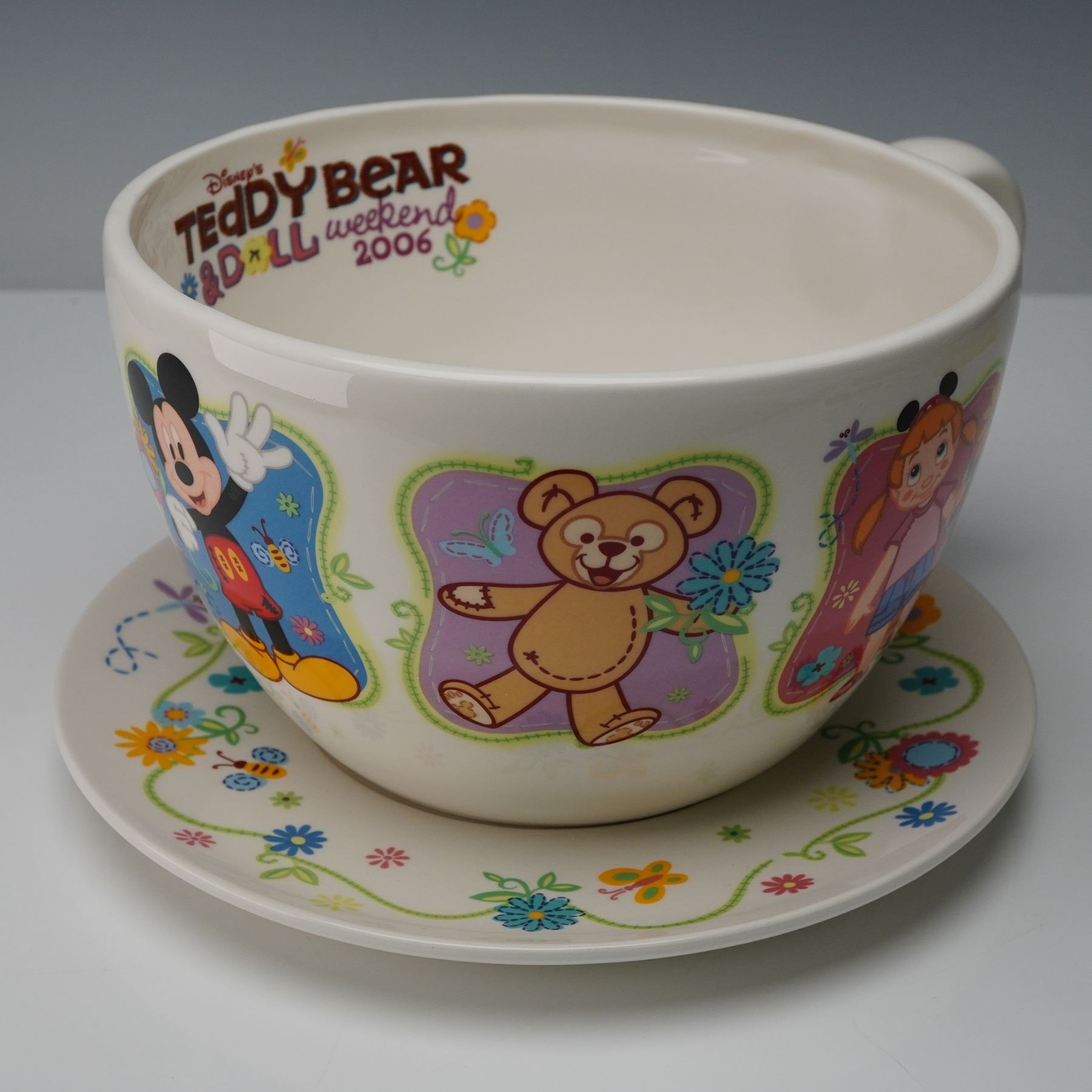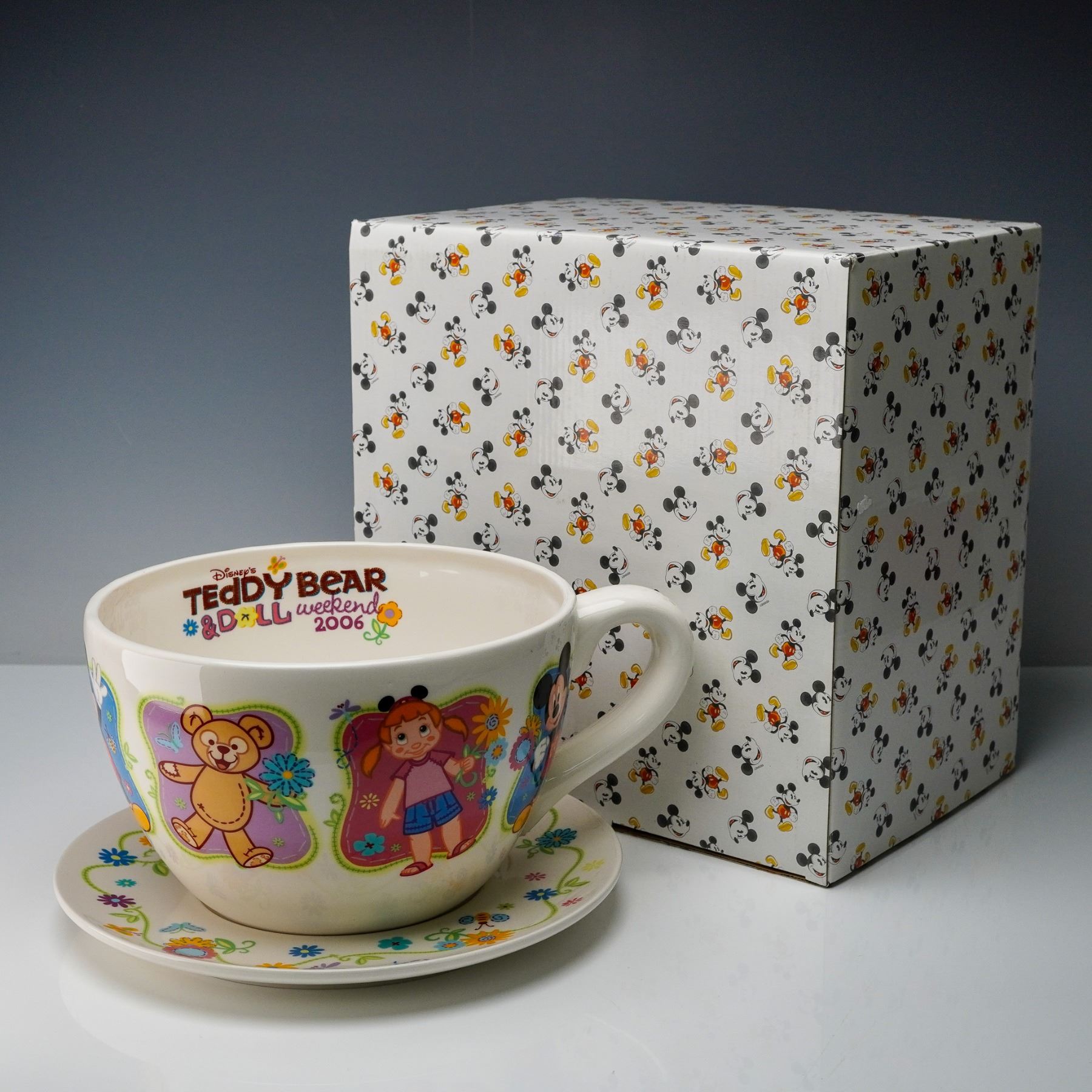 Commemorating Disney's Teddy Bear & Doll Weekend 2006, this oversized decorative cup and saucer set features vibrant floral artwork with Mickey Mouse and a young girl in cheerful celebration. The colorful illustrations wrap around both pieces, complemented by playful bees and flowers. Designed more for display than daily use, the set captures the nostalgic charm of the beloved Disney event. Includes the original box, making it a delightful addition to any Disney or character-themed collection.