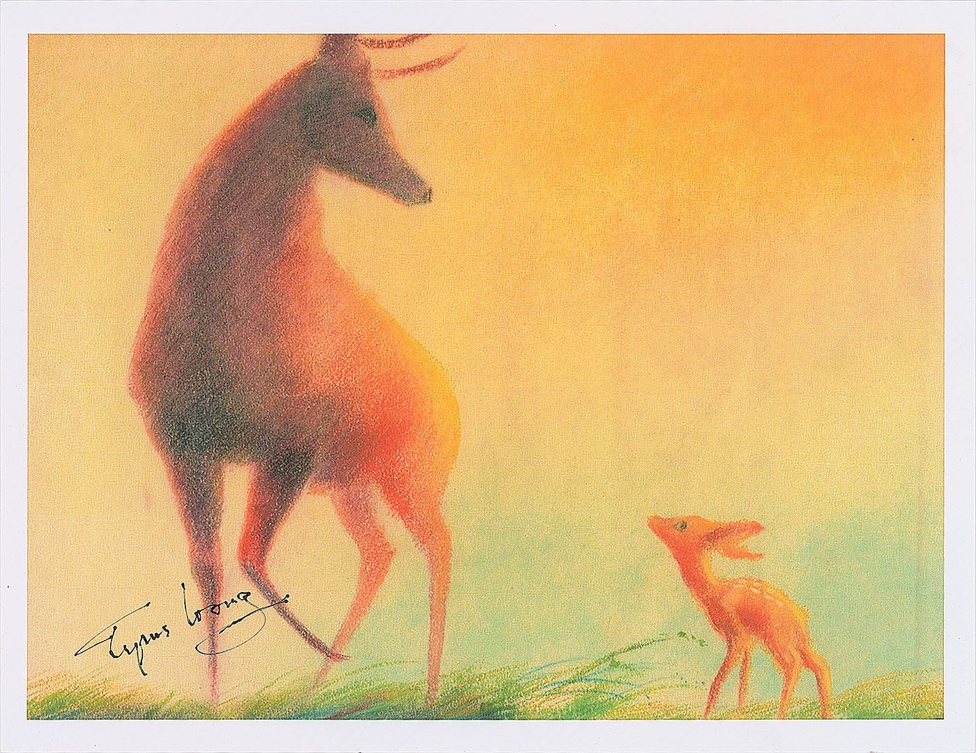 Chinese-born American artist (1910–2016) who, as a film production illustrator, worked for Disney and Warner Brothers, including as the lead artist on Disney's 1942 film Bambi. Beautiful pair of color 8.5 x 11 heavy paperstock photos of Tyrus Wong concept paintings for the classic 1942 animated film Bambi, both signed in black ink by Wong. In overall very fine condition.