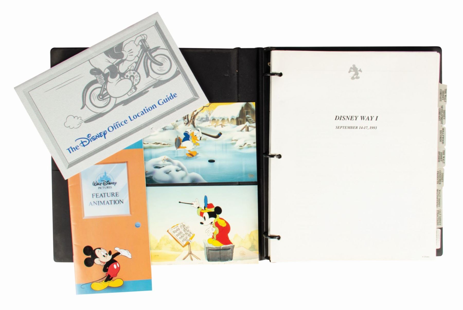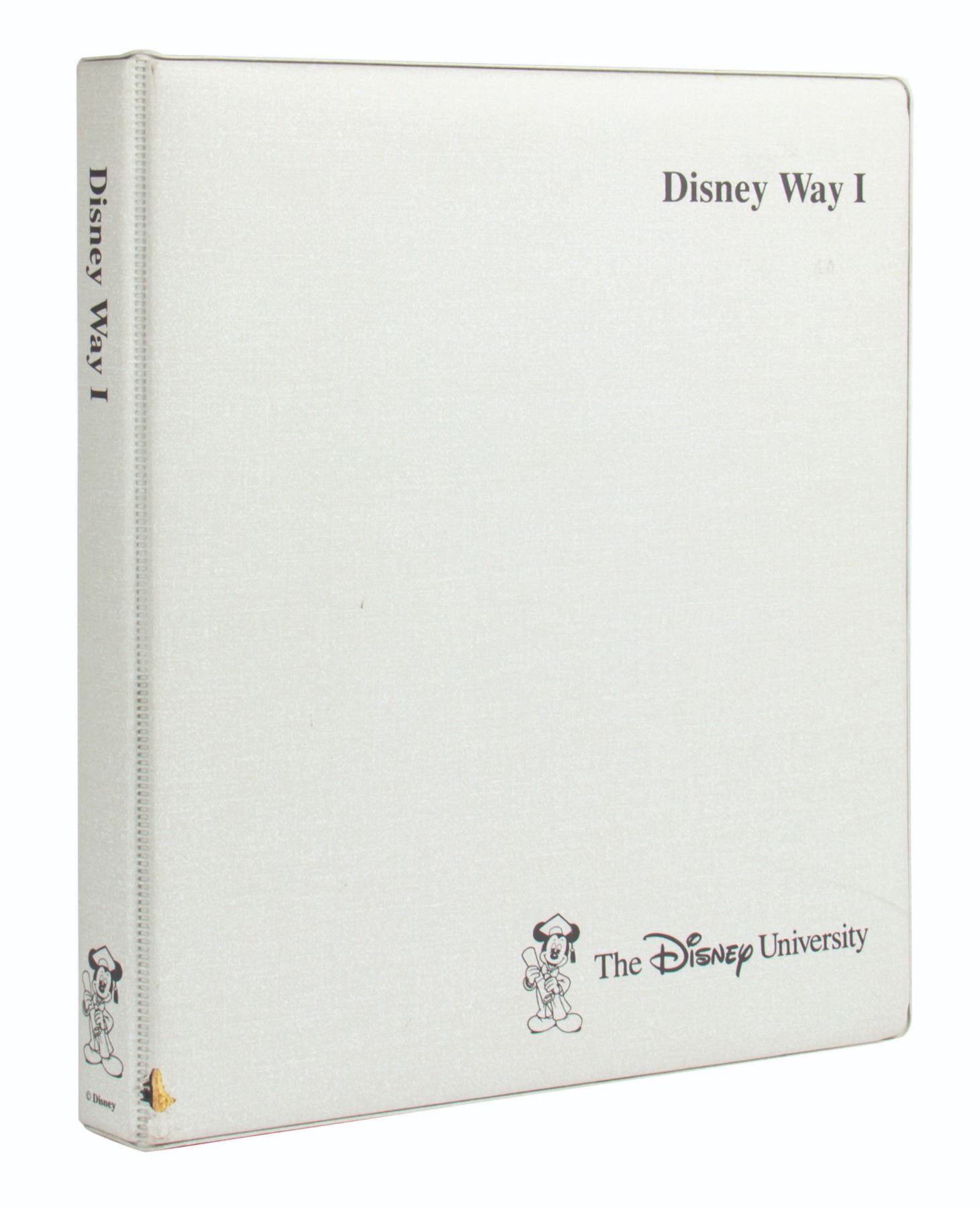 (Disneyland, 1993) A training binder from Disney University titled "Disney Way I." This training binder is from a 4-day Disney Studios seminar and provides information about Hollywood Records, Disney consumer products, Walt Disney Imagineering, Walt Disney attractions, and more. Included in this collection are (2) postcards, a brochure describing the process of feature animation, and a Disney office location guide. The binder measures 11.5"x10" and is in very good condition with some ink stains on the reverse of the binder.