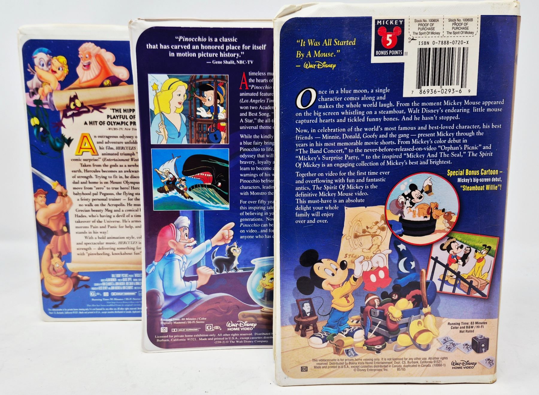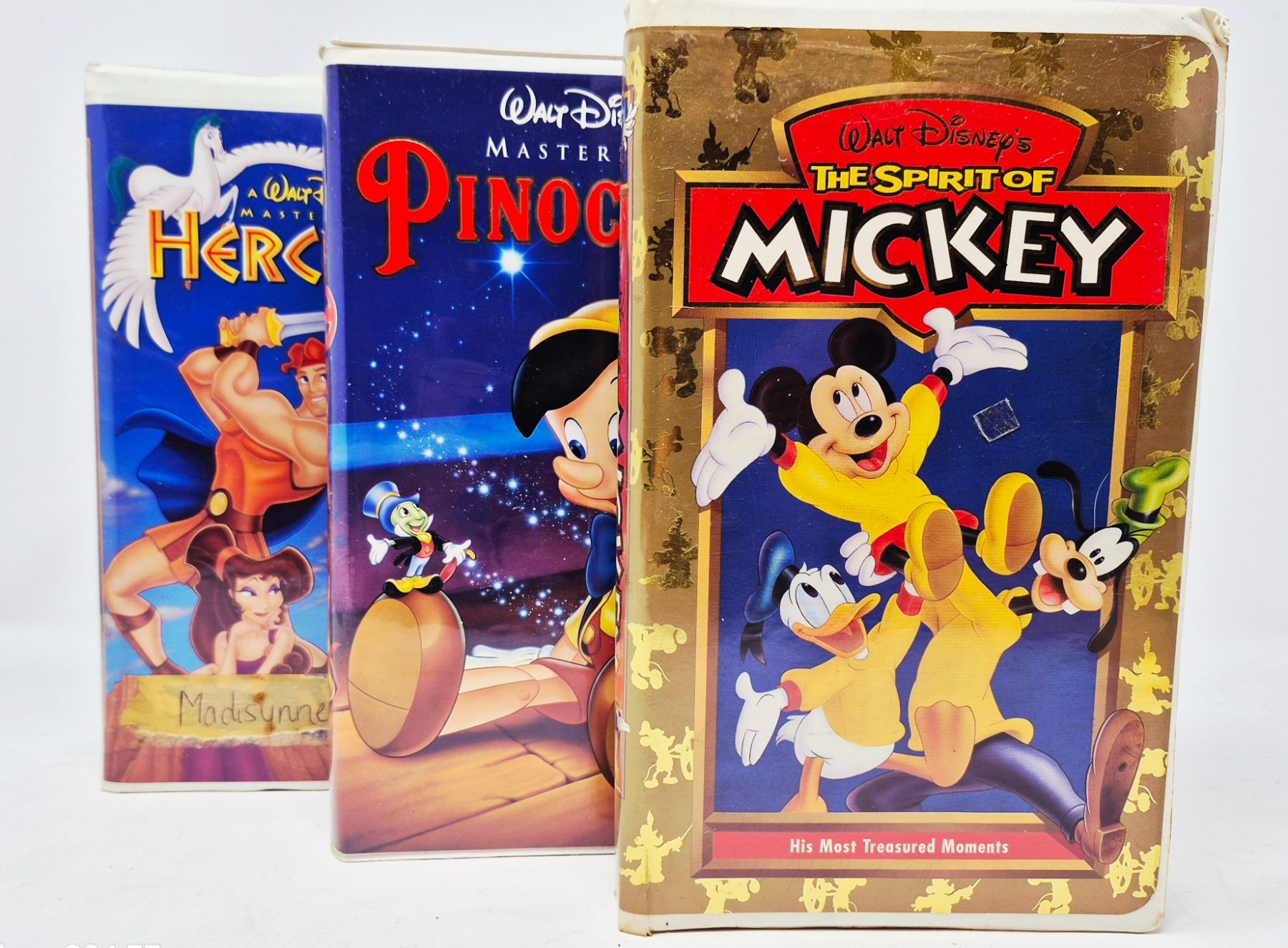 Three classic Walt Disney VHS tapes in clamshell cases: Pinocchio, Hercules, and The Spirit of Mickey. Beloved titles for collectors or kids.