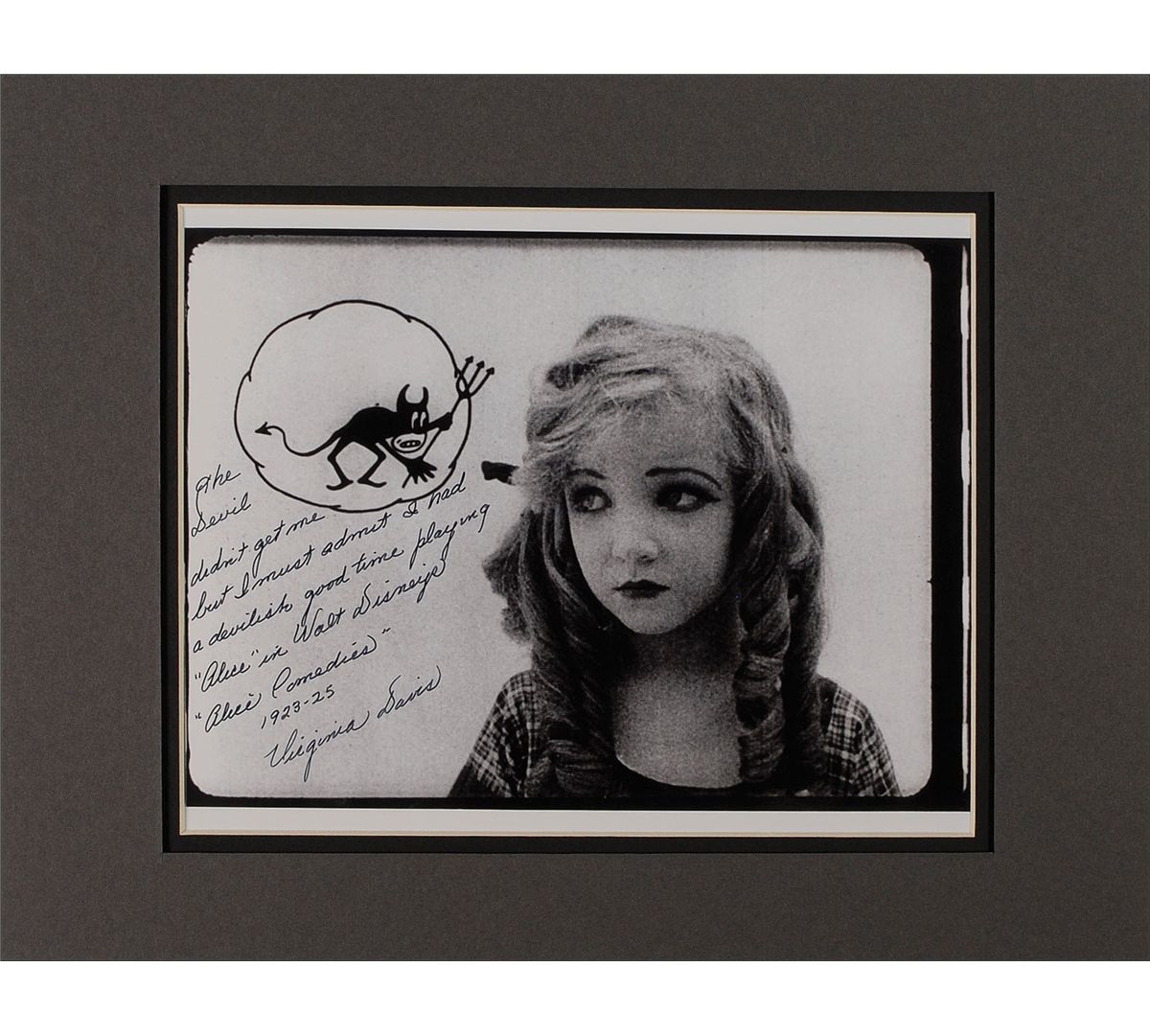 Child actor (1918–2009) who would become Disney’s first star when she appeared in Walt Disney series, Alice Comedies. Whimsical glossy 10 x 8 photo of a young Davis peering at a cartoon image of the devil with a pitchfork, signed in black felt tip, “The Devil didn’t get me, but I must admit I had a devilish good time playing ‘Alice’ in Walt Disney’s ‘Alice Comedies,’ 1923–25, Virginia Davis.” Double-matted to an overall size of 14 x 11. In fine condition.