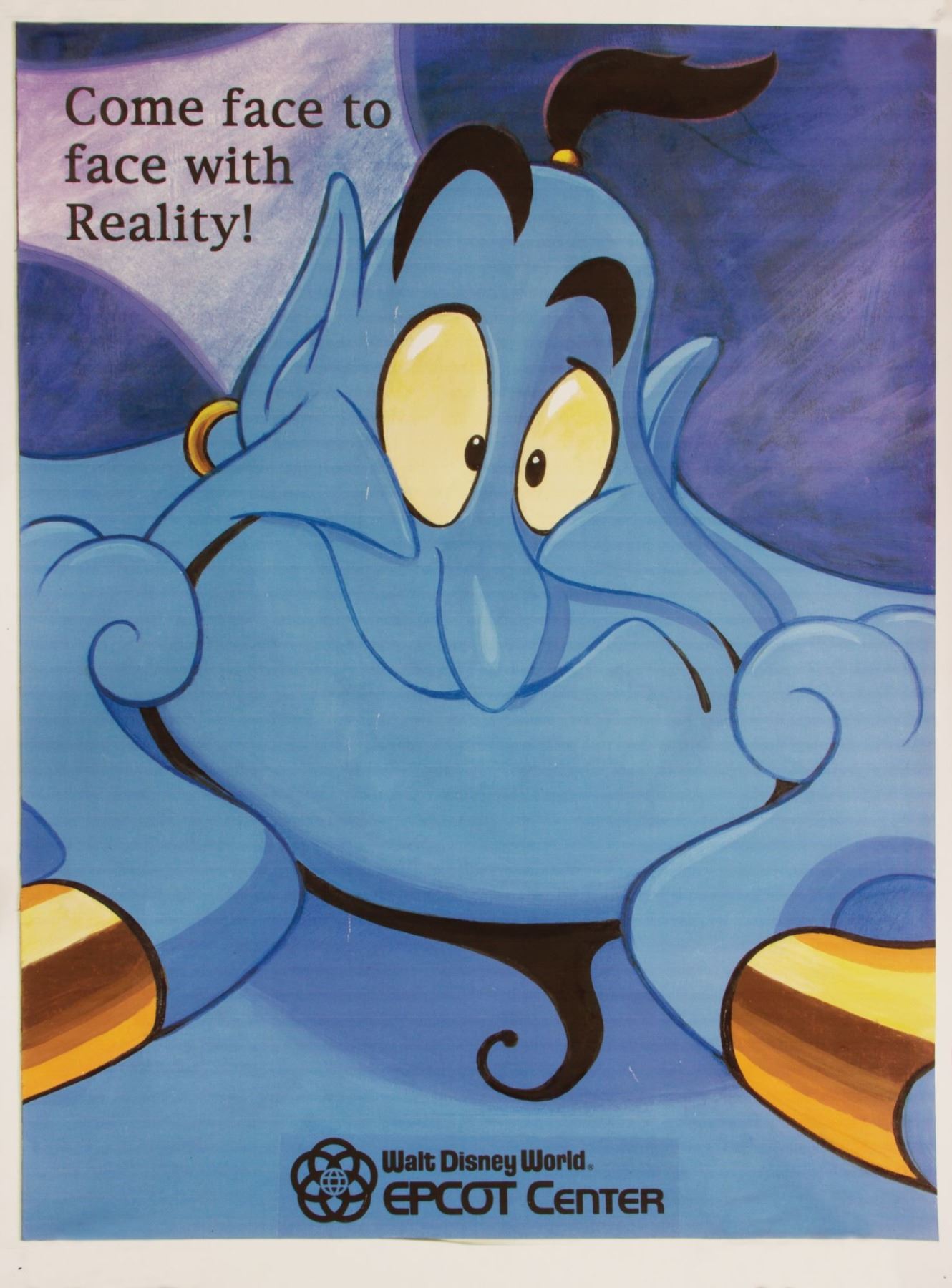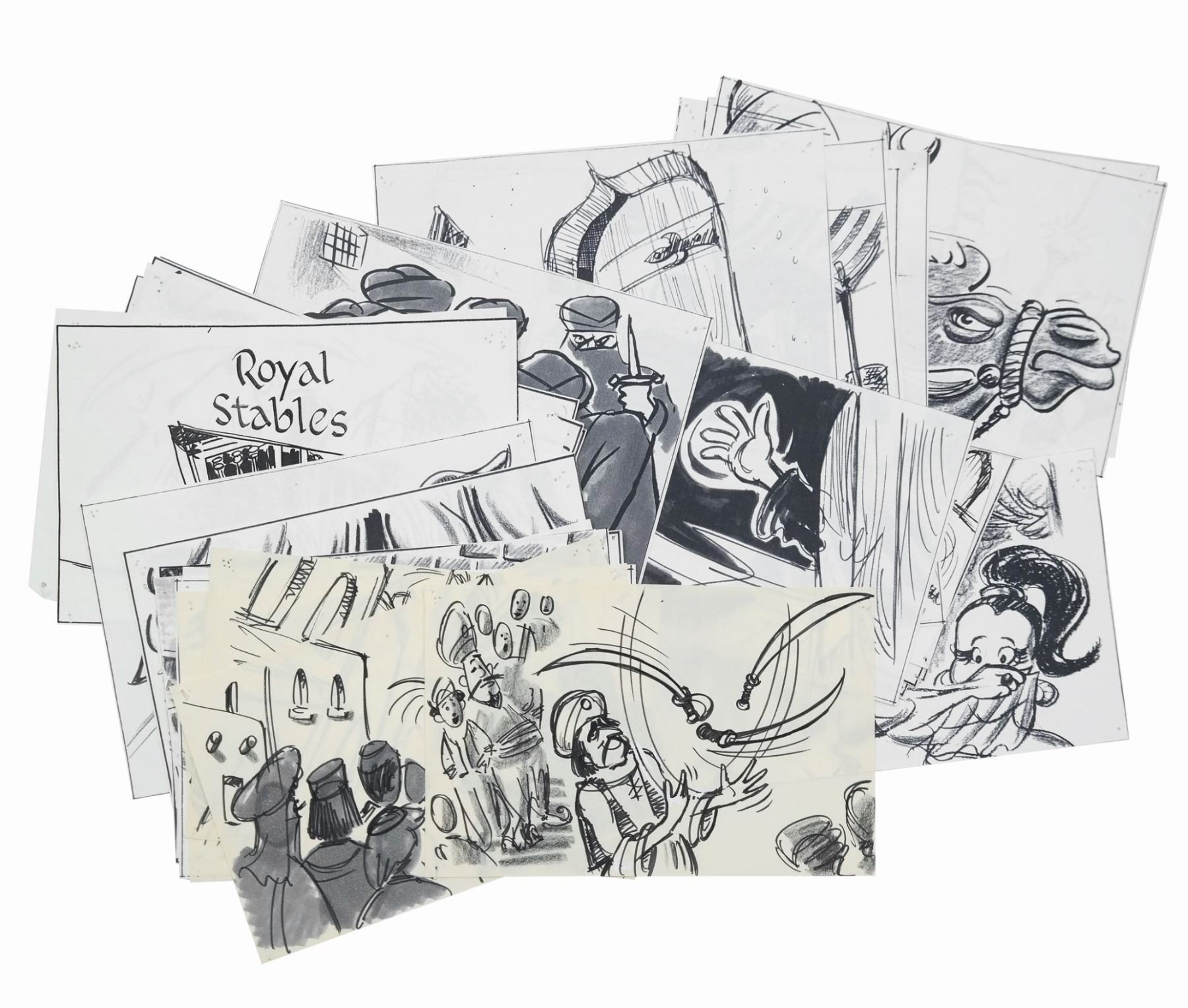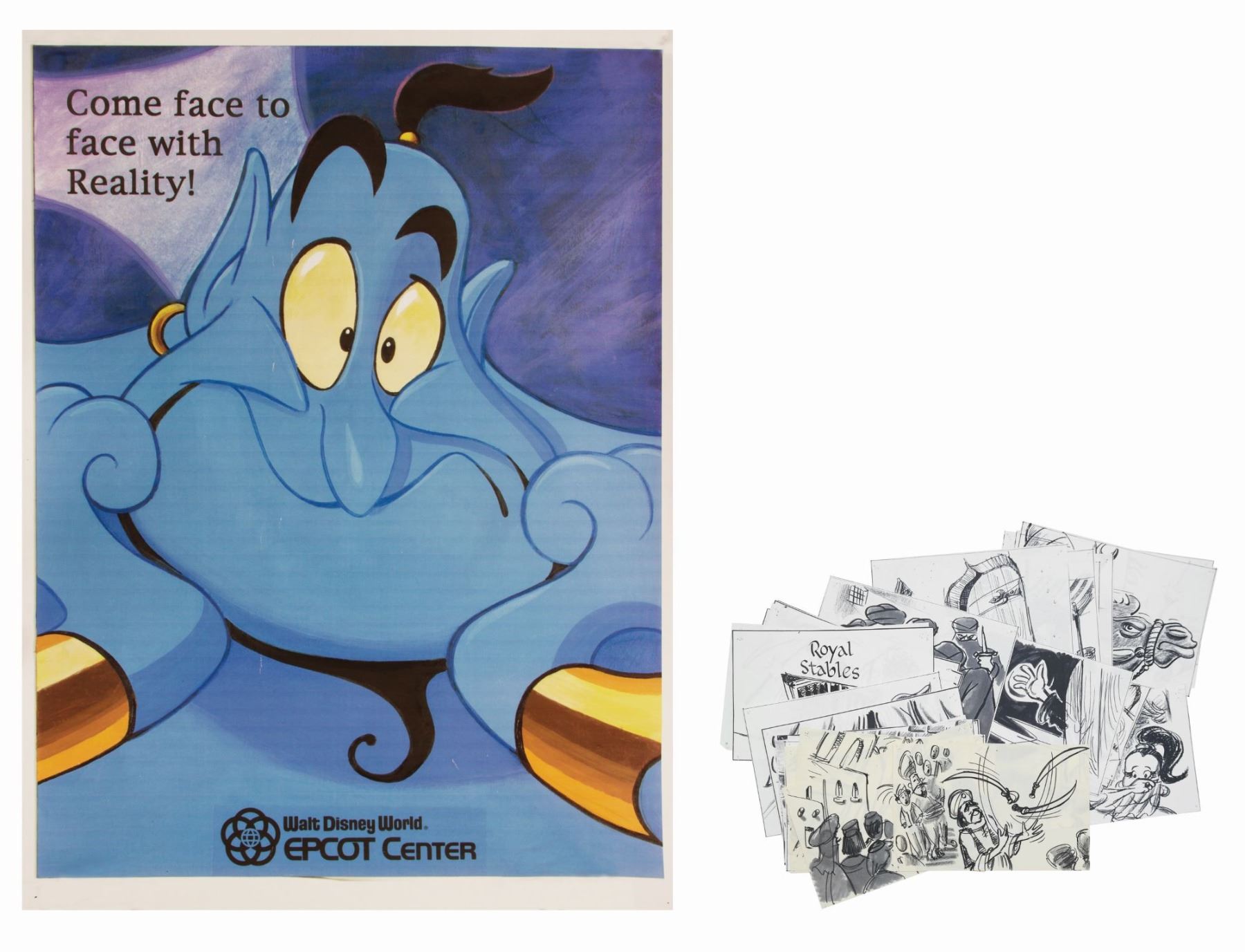 (Epcot, 1990s) A very rare set of (36) printed storyboards and (4) hand-drawn storyboards with a printed concept poster from Disney Vision Adventure: In Virtual Reality. These storyboards were used in the development of this historic Imagineering project, which marked the first use of virtual reality in an attraction. Based on characters and themes from Aladdin, the attraction opened in Communicore and eventually moved to DisneyQuest. The storyboards measure 5"x8" and the poster measures 32.5"x24". The set is in very good condition with minor wear from use including pin holes in the corners of the storyboards and some creases to the poster.