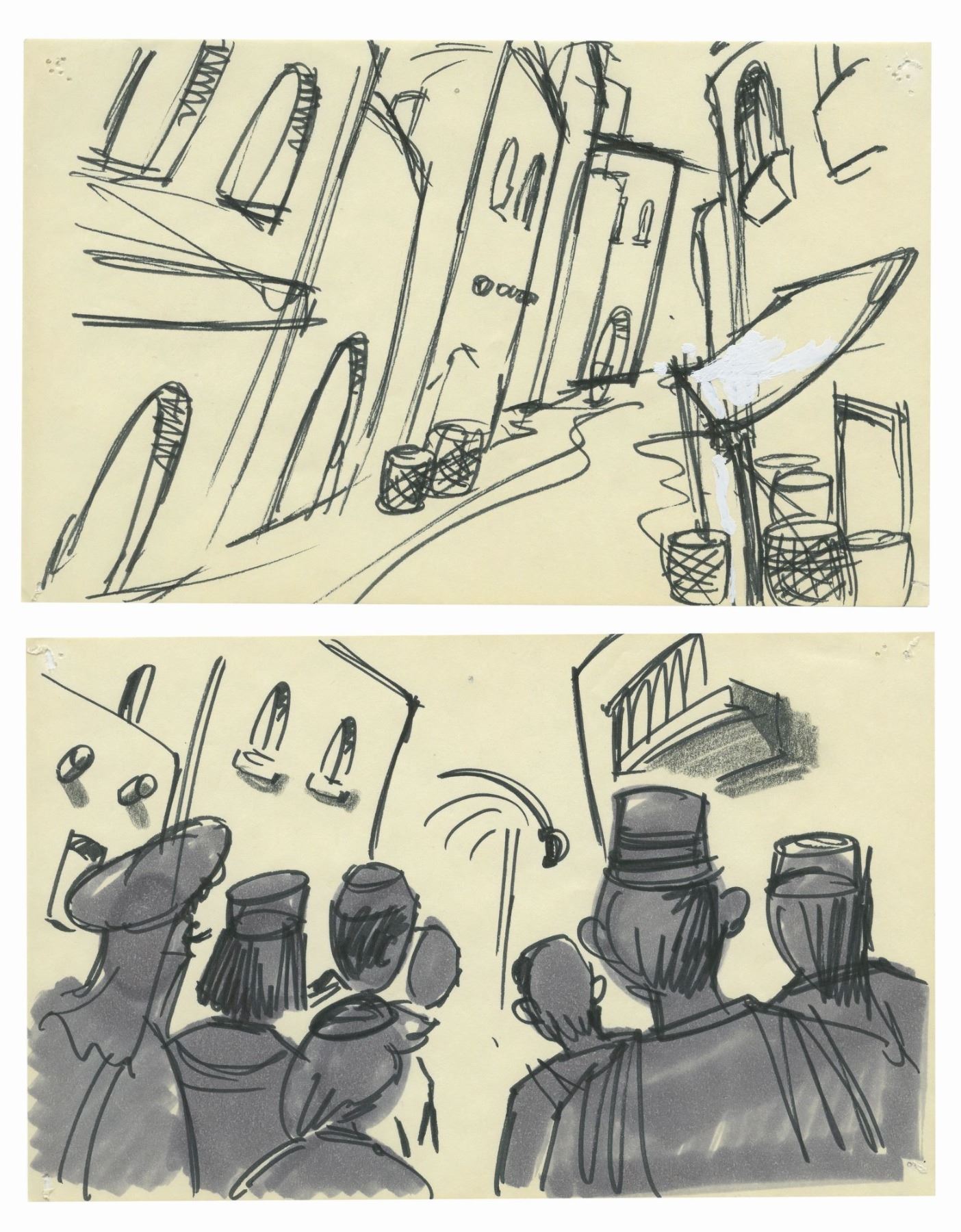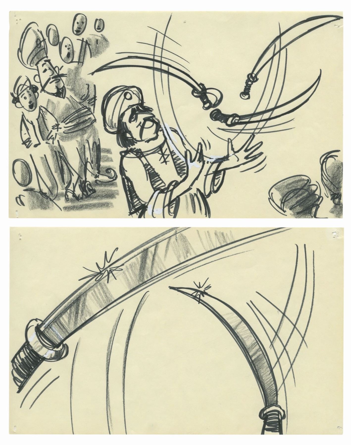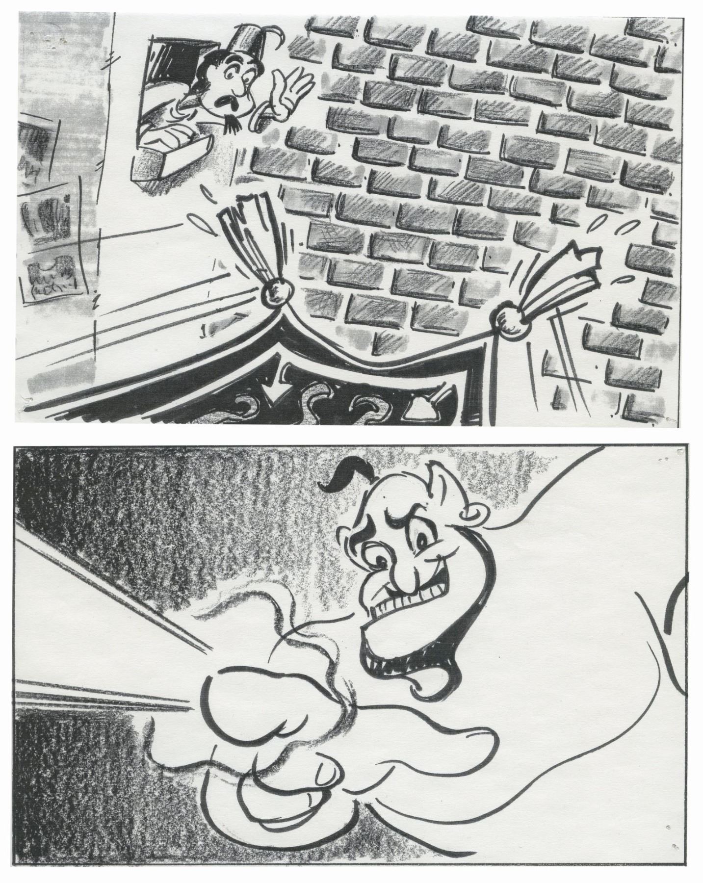 (Epcot, 1990s) A very rare set of (36) printed storyboards and (4) hand-drawn storyboards with a printed concept poster from Disney Vision Adventure: In Virtual Reality. These storyboards were used in the development of this historic Imagineering project, which marked the first use of virtual reality in an attraction. Based on characters and themes from Aladdin, the attraction opened in Communicore and eventually moved to DisneyQuest. The storyboards measure 5"x8" and the poster measures 32.5"x24". The set is in very good condition with minor wear from use including pin holes in the corners of the storyboards and some creases to the poster.