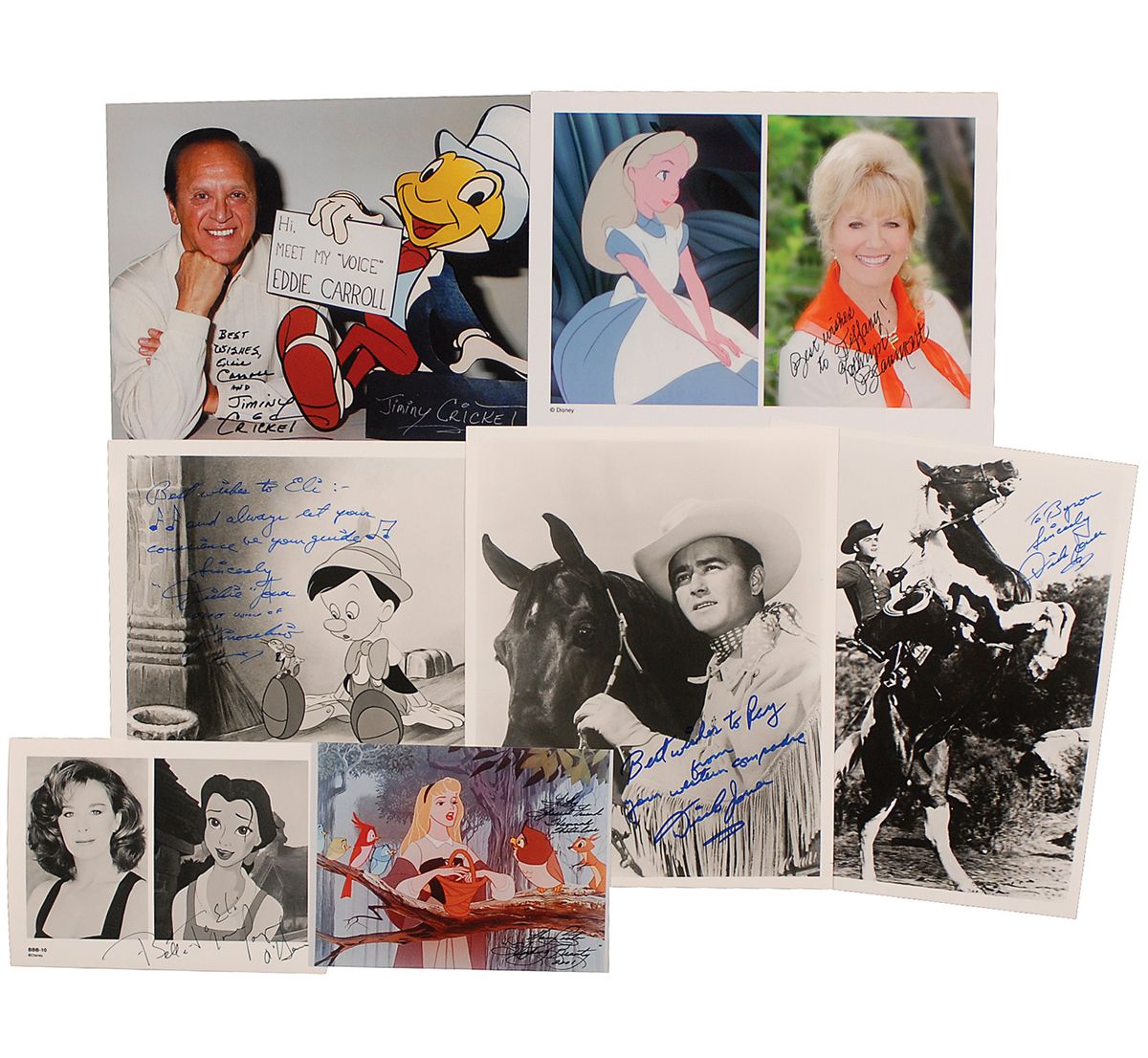 Seven glossy photos, three color, ranging in size from 6.5 x 5 to 8 x 10, each signed and inscribed in blue or black felt tip by the respective Disney voice actor pictured, with many adding their character name. Signers are: Paige O'Hara, Dickie Jones (3), Kathryn Beaumont, Mary Costa, and Eddie Carroll. In overall fine condition, with light creases to a couple of photos. Kathryn Beaumont rarely signs any longer.