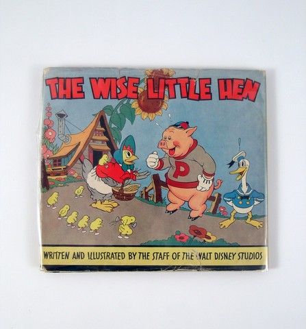 This is an original Whitman Publishing Company book of Disney's "The Wise Little Hen" (1935). It is not only a rare piece in itself, with beautiful color covers, color plates and ink reproductions inside, but it is also known for being the first appearance of Donald Duck (check out how different he looks from what he became!). With the original dust jacket. In good condition, with patina aging on the pages and some wear. The story is a take on the fable "The Little Red Hen", which became a cause célèbre during the 1950's McCarthy witch hunts, and brought a surprised and innocent Walt Disney an "invitation" to speak to the committee! (Book is 10"x9").