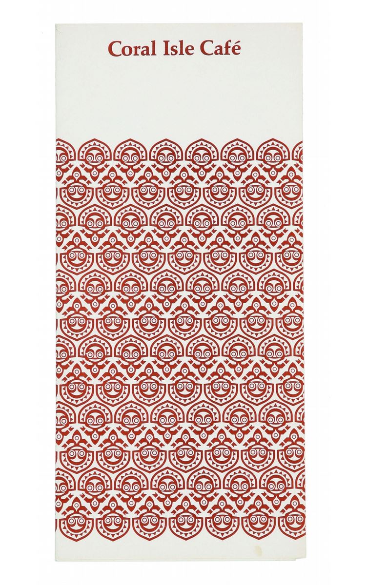 (Walt Disney World, 1971) Rare first year lunch menu for the Coral Isle Cafe in the Polynesian Resort at Walt Disney World. The tri-fold menu features resort themed graphics and measures 6”x13.25” folded. In very good condition with very little wear.