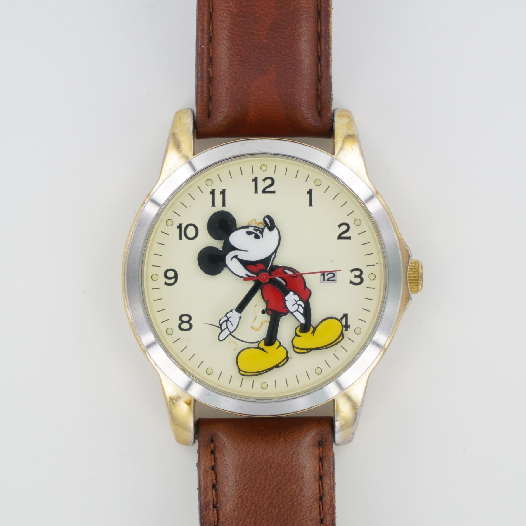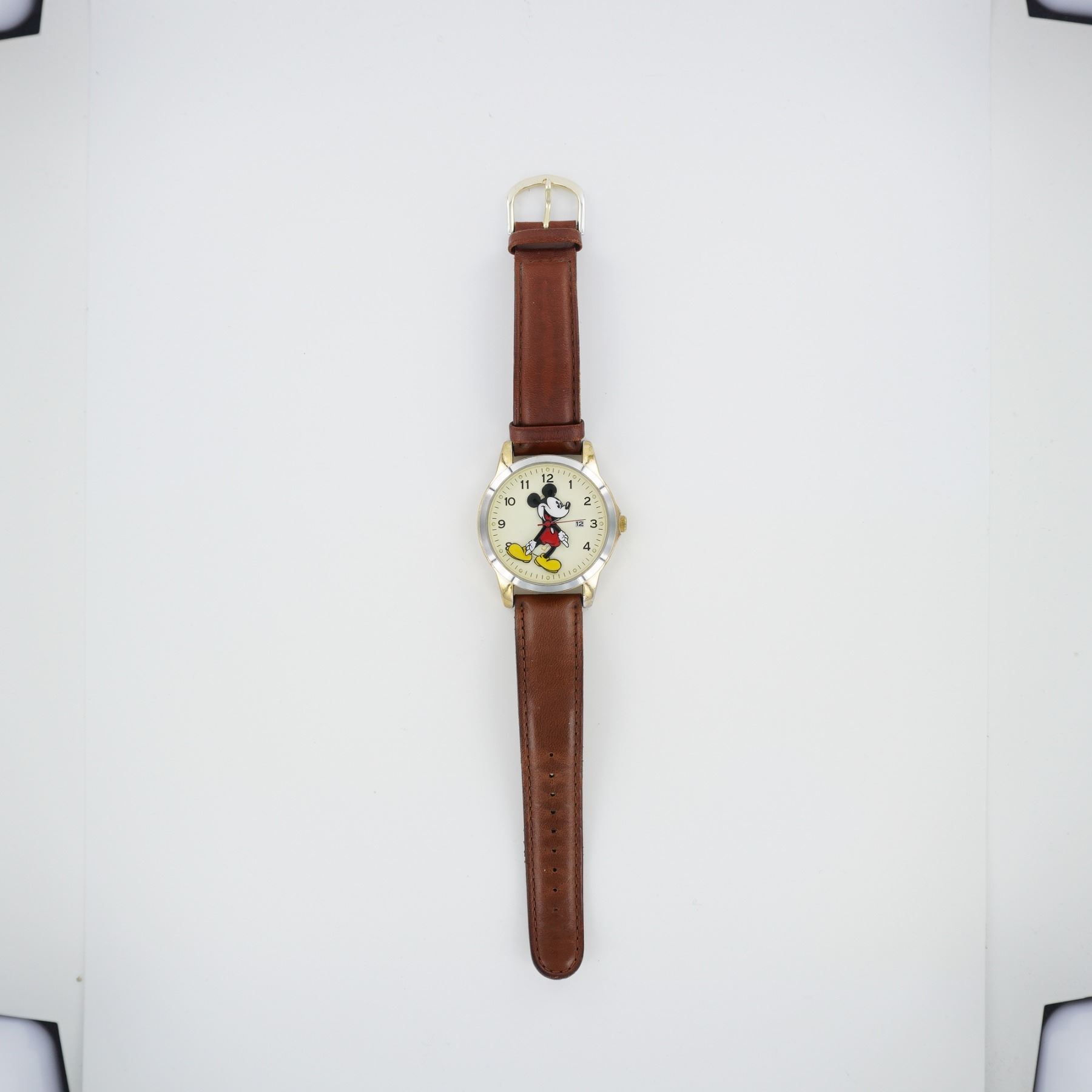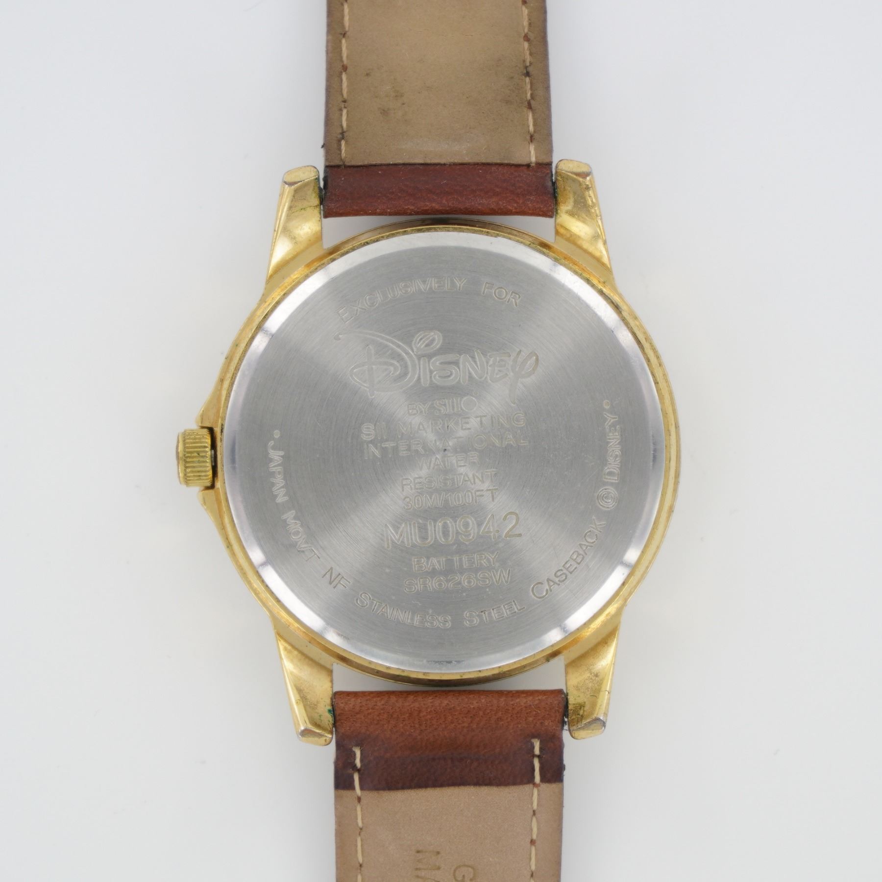 Stainless steel caseback marked "Exclusively for Disney by SII Marketing International." Round cream dial featuring Mickey Mouse with arms as hour and minute hands. Arabic numeral hour markers and date window at 3 o'clock. Gold-tone bezel, crown, and lugs. Brown leather strap with buckle. Japan movement and water resistant. Model reference: MU0942.