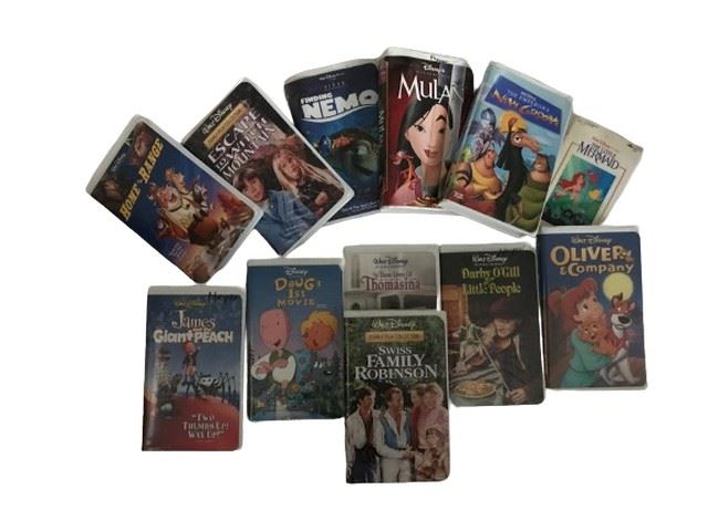 A collection of Disney classic VHS tapes. The list includes James and the giant peach, home on the Range, Doug’s first movie, escape to witch Mountain, Swiss family Robinson, the three lives of Thomasina, Darby O’Gill and the little people, Oliver and Company, the emperors new groove, Mulan, finding Nemo, and the little mermaid book on cassette tape.