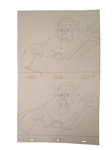 From Disney's highly emotionally charged version of "Beauty and the Beast" (1991), these are three progressive original production drawings of the Beast. These actual animation drawings are made on reinforced registration keyed animation paper with cell numbers "C24" and "C27" written on the lower right hand corner. One has the animator's initials "S.M.". They are approx. 12"x11.5". Comes with a COA.