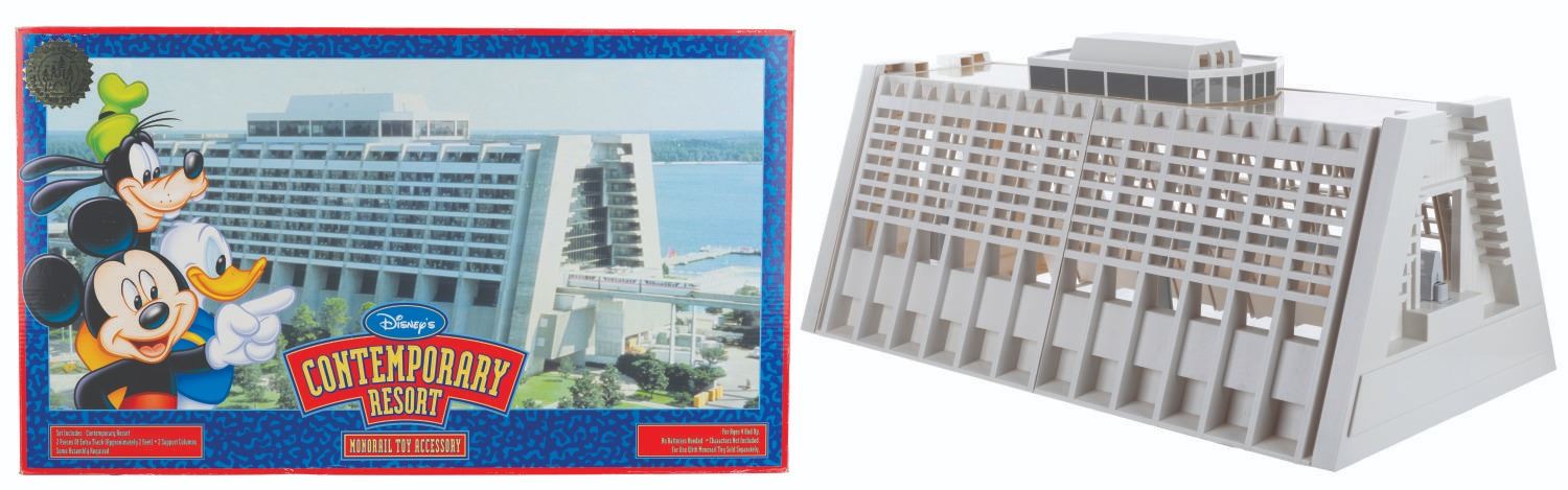 (Walt Disney World, 2000s) A Disney Contemporary Resort Monorail playset accessory from the Walt Disney World Monorail Collection. The assembled set measures 13.5" x 24 x 10.5" tall and is in very good condition, with typical light wear to the original box.