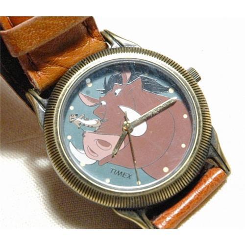 Rare & Collectible Watch, Walt Disney's Pumba the wart hog from the Lion King movie. It is water resistant. The goldtone bezel is serated. The dial as you can see features a close up shot of the lovely wart hog Pumba. Timon the merecat standing upon his snout. <P> The watch comes on a genuine leather band. The leather shows some creasing mainly where the strap goes though the buckle. <P> The watch case and bezel are in excellent shape. <P> The mineral crystal appears be in superb contidion free on any nicks or scraches. The watch with the band including the buckle is 9 1/2" long. <P> It works excellently and comes with a brand new working quartz battery. <p>