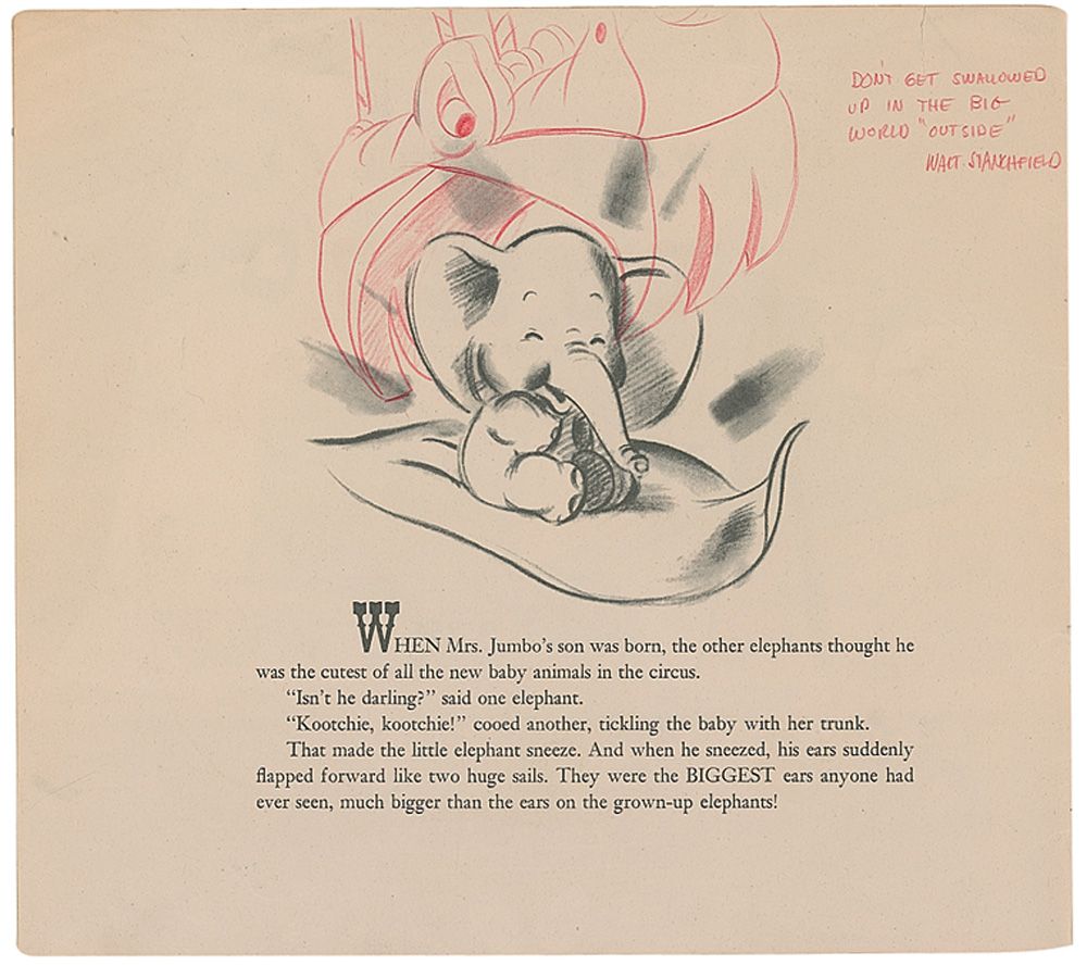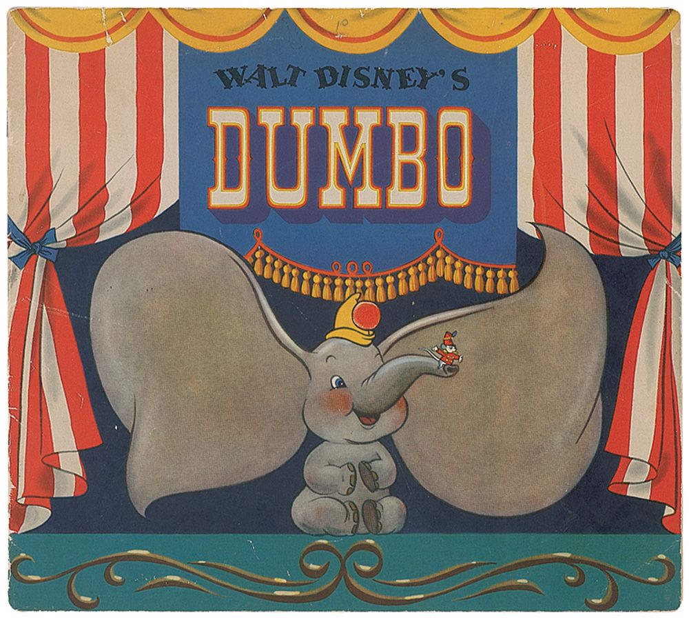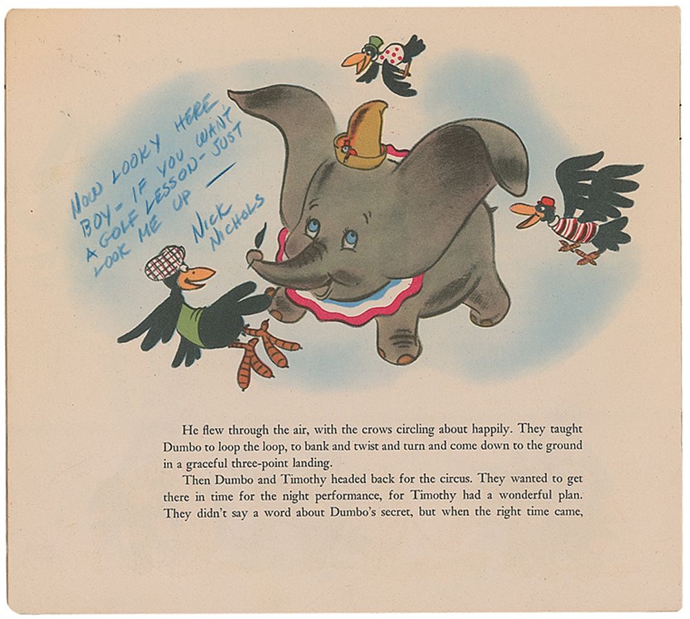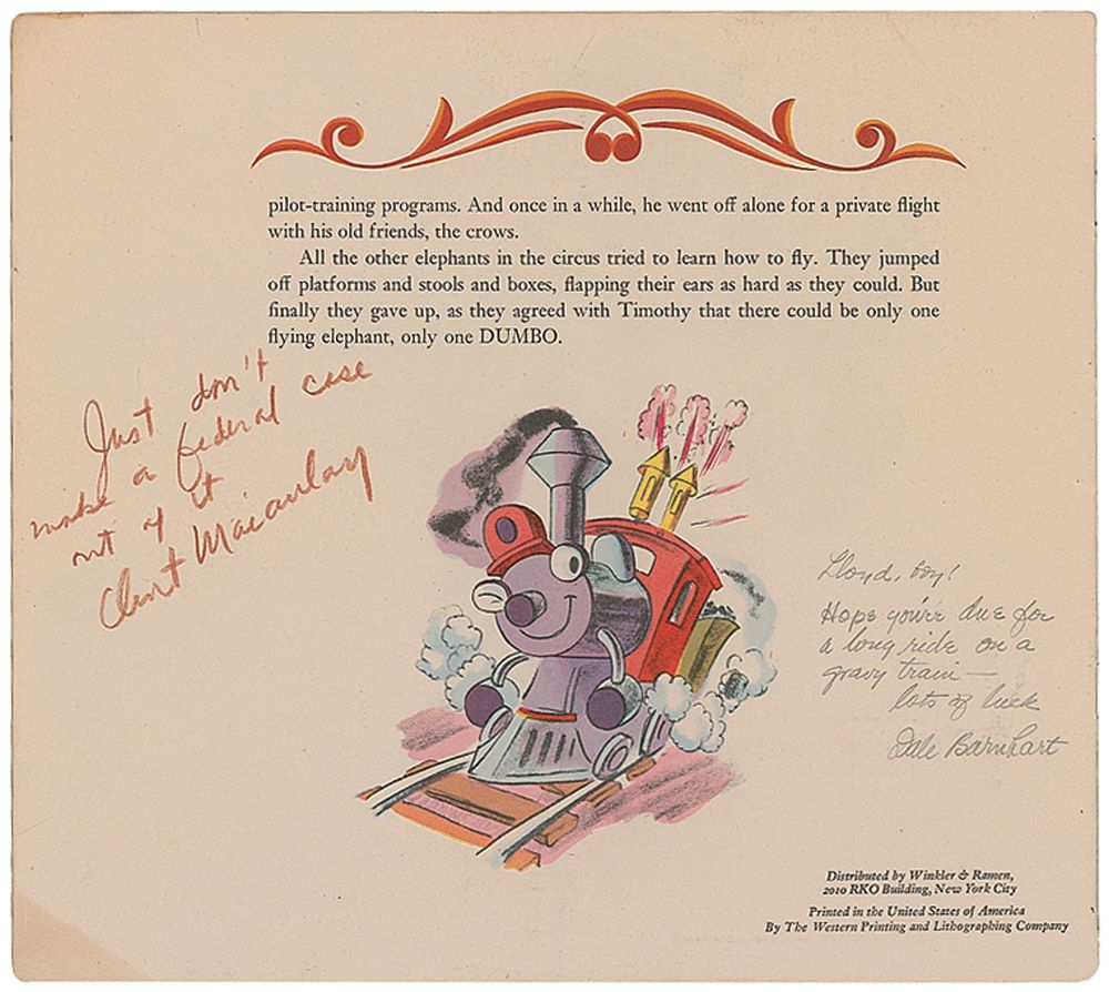 Signed book: Dumbo. Concurrent printing, softcover, 10 x 9. Walt Disney Productions, 1941. Softcover, 10 x 9. Signed inside by several Disney animators and artists. Signers include: Bill Keil, Walt Stanchfield (adding a sketch), Bee Tomango, Don Hillary, Tony Rizzo, Dick Lucas (adding a sketch), Art Stevens, Nick Nichols, Ted Robinson, Clint McCauley, and Dale Barnhart. Several others have signed only with their first name. The item was a farewell present to a co-worker with many sentiments wishing him good luck. Scattered wrinkling and soiling, otherwise fine condition.
