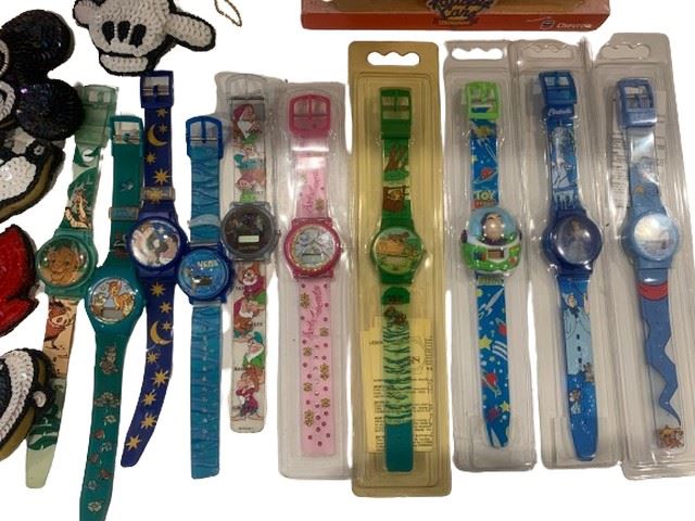 And assortment of Disneyana collectible items. Includes an Autotopia toy car, still in the package, a Mickey Mouse candy /gumball machine from 1968 made by Hasbro, a Little Mermaid "welcome" hanging sign, a Tigger "let it snow" window sign, six Mickey/Minnie Mouse beaded Christmas tree ornaments and an assortment of Disney themed watches with five still in their original packaging. Also included is a unique Mickey Mouse hand shaped calculator (functioning).