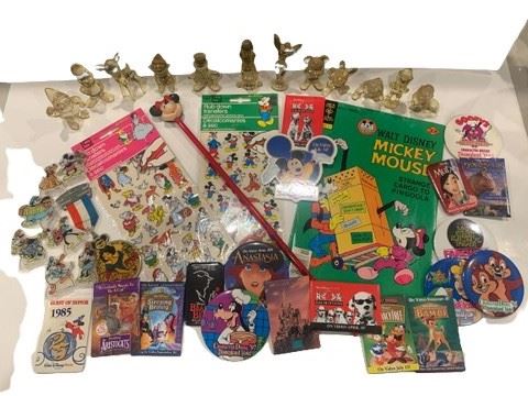 A Disneyana collector’s assortment of stickers (still in the package), a long Minnie Mouse pencil, a Mickey Mouse comic book from November 1977, several Disney collectible buttons, a guest of honor sticker from 1985, an assortment of game pieces, and a badge from Hanau Military Community recreation centers 1978 German-American Volksmarsch featuring Snow White and the seven dwarves.