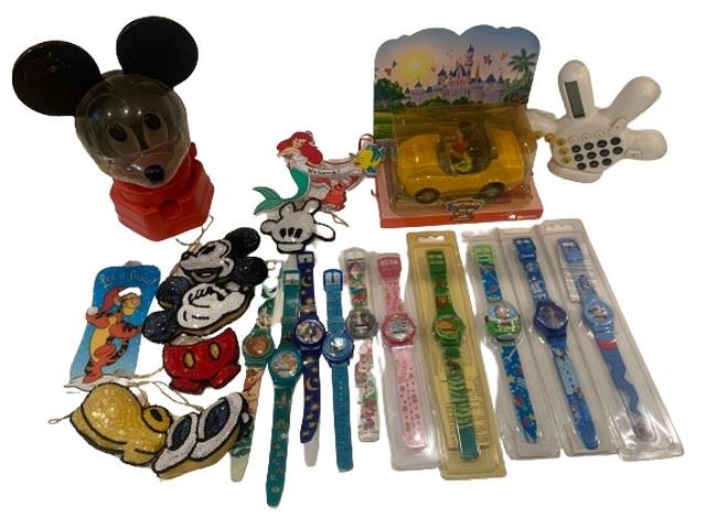 And assortment of Disneyana collectible items. Includes an Autotopia toy car, still in the package, a Mickey Mouse candy /gumball machine from 1968 made by Hasbro, a Little Mermaid "welcome" hanging sign, a Tigger "let it snow" window sign, six Mickey/Minnie Mouse beaded Christmas tree ornaments and an assortment of Disney themed watches with five still in their original packaging. Also included is a unique Mickey Mouse hand shaped calculator (functioning).
