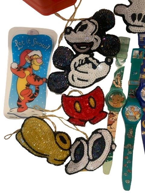 And assortment of Disneyana collectible items. Includes an Autotopia toy car, still in the package, a Mickey Mouse candy /gumball machine from 1968 made by Hasbro, a Little Mermaid "welcome" hanging sign, a Tigger "let it snow" window sign, six Mickey/Minnie Mouse beaded Christmas tree ornaments and an assortment of Disney themed watches with five still in their original packaging. Also included is a unique Mickey Mouse hand shaped calculator (functioning).