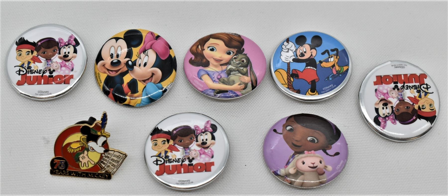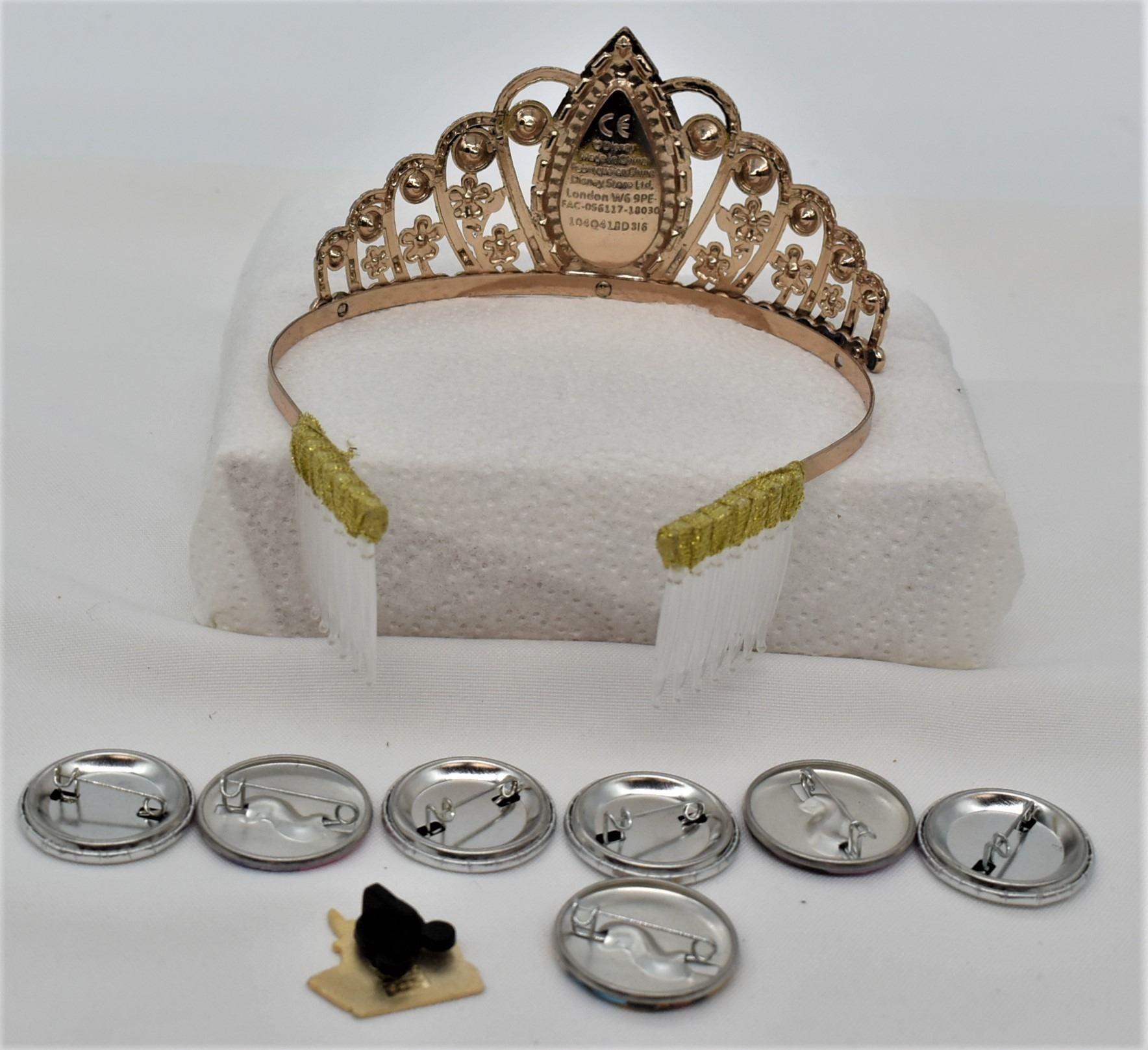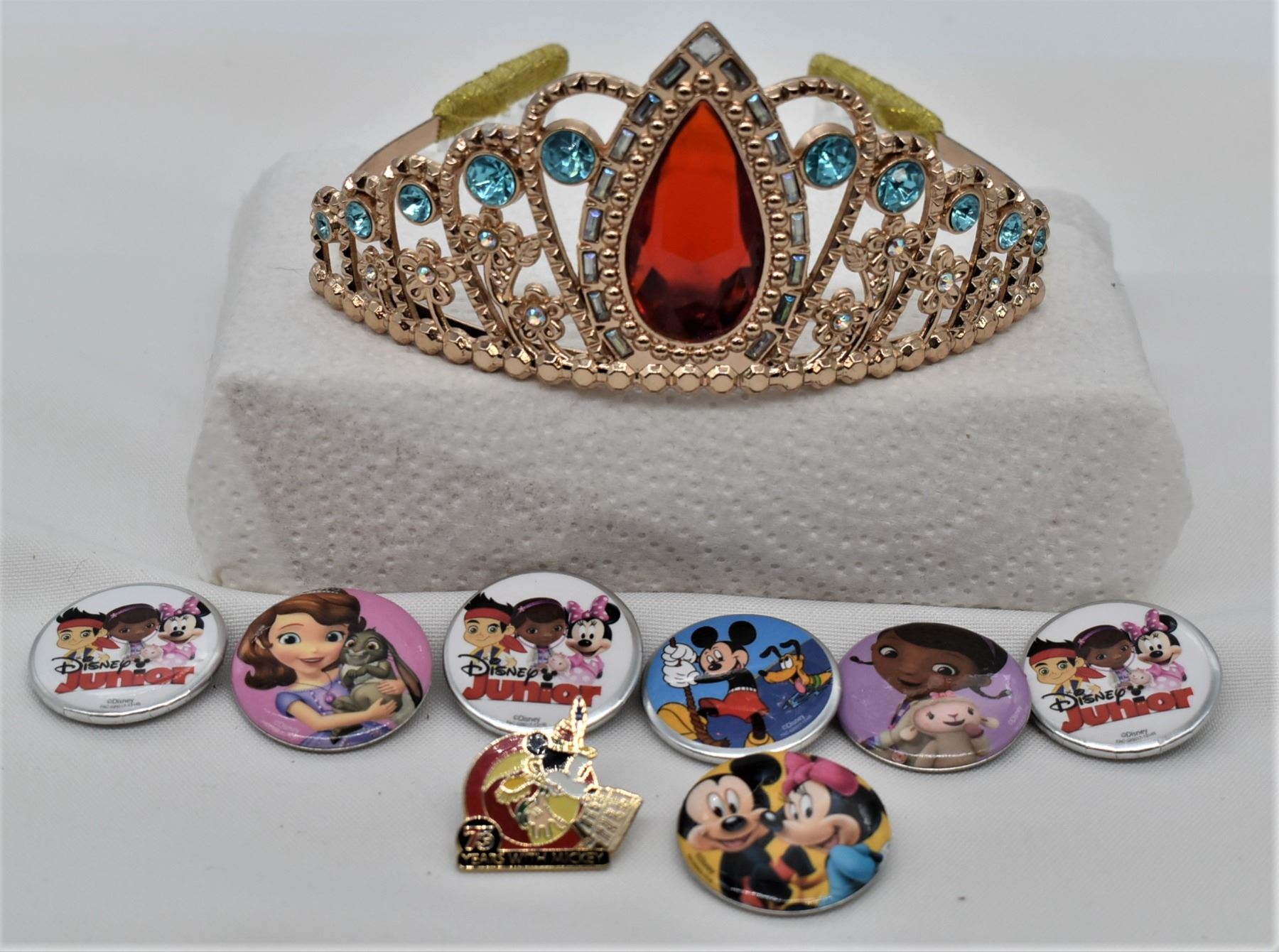 Disneyana Crown and Buttons, includes CE Crown, 75 Years with Mickey Pin, 5 Disney Junior Pins, Mickey & Minnie Pin, Mickey & Pluto Pin, tiara measures 2 3/8''H x 14'' inside