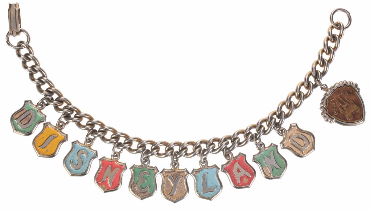 (Disneyland, 1960s) Charm bracelet featuring (11) charms that spell out "Disneyland" and show Sleeping Beauty Castle. Chain measures 6.75" long. In very fine condition with some wear to the charm paint.