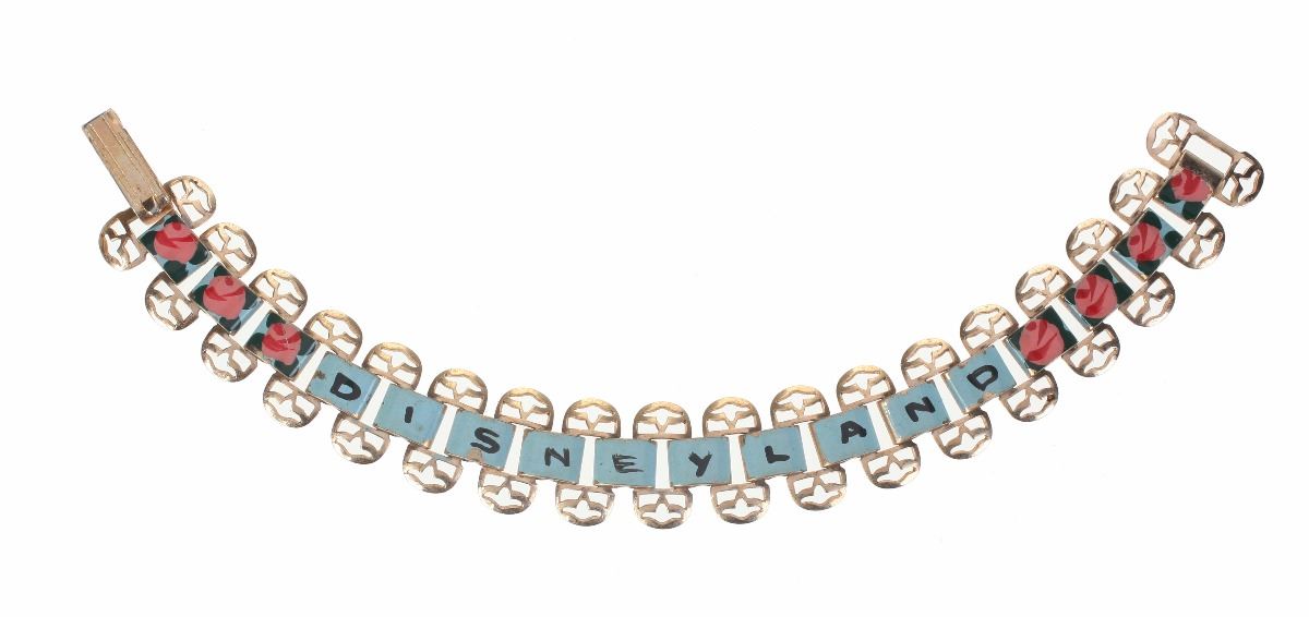 (Disneyland, 1950s) Charm bracelet featuring (17) hand-painted blue links with roses and the word "Disneyland" across the links. Chain measures 5.5" long. In fine condition with minor wear to aspects of the paint.
