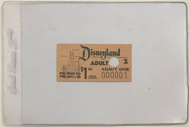 (Disneyland c. 1990's). An official Disney reproduction ticket of the first ever sold Disneyland booth admission ticket, which Roy Disney purchased at booth #2 on opening day of the park. The ticket is in good condition with normal wear from age and minimal handling. Item comes with a Grand Circle Tour Auctions COA.