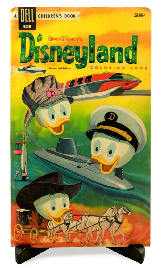An interesting coloring book from 1957 in that it features the soon to be released Monorail and Submarine Voyage on the cover. Published by Dell.