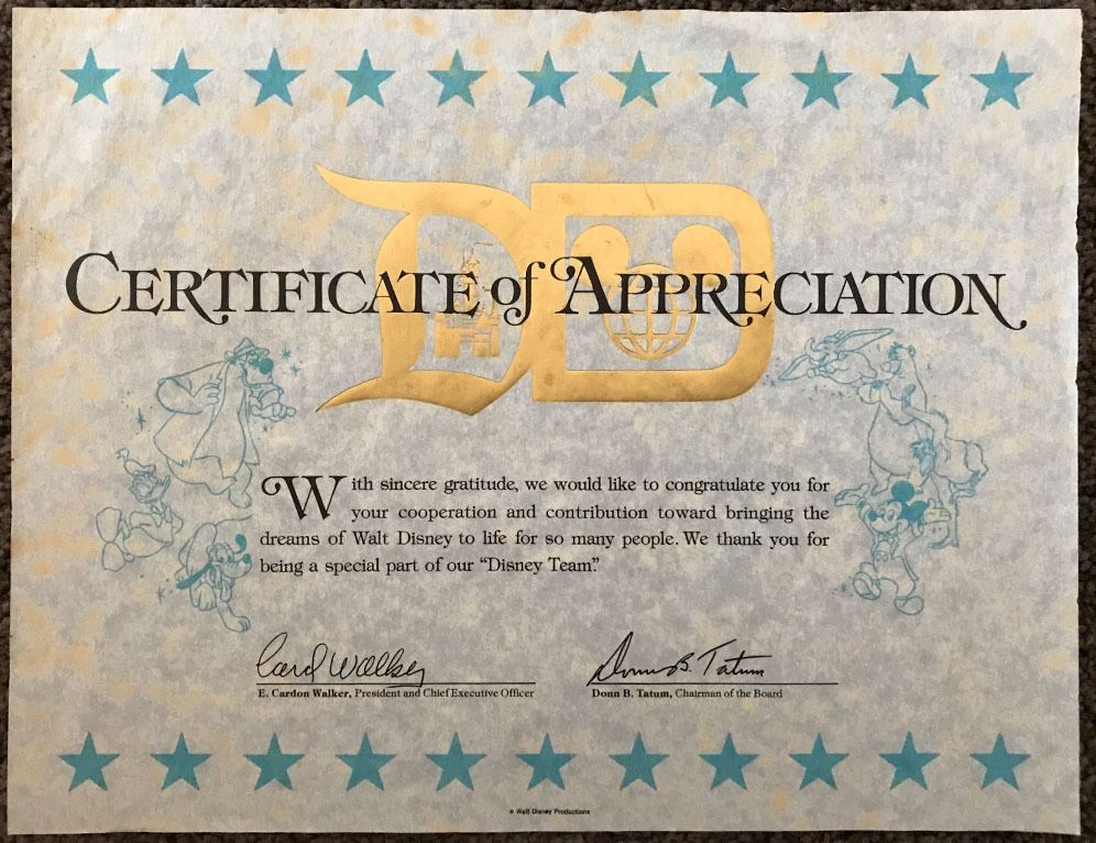(Disneyland c. 1975). A rare Disneyland "Certificate of Appreciation" given to cast members. This certificate displays both the Disneyland and Walt Disney World logos, though this specific certificate was given to a former Disneyland employee. The certificate features classic Disney characters including Mickey Mouse, Donald Duck, Dumbo, Pluto and more. The certificate measures approximately 10.5" x 7.5" and is in good condition with normal wear from age and minimal handling. Item comes with a Grand Circle Tour Auctions COA.