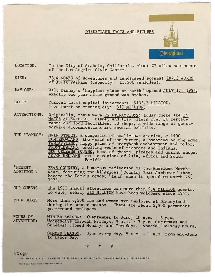 (Disneyland, c. 1970's). A Disneyland "Facts and Figures" report from the early 1970's, citing park attendance data from 1971 and since the opening of Disneyland in 1955. The report also notes other information like original opening day investment and current total capital investment, number and details of lands and attractions, new additions to the park, number of guests to the park, and more. The report is in good condition with normal wear from age and handling. Item comes with a Grand Circle Tour Auctions COA.